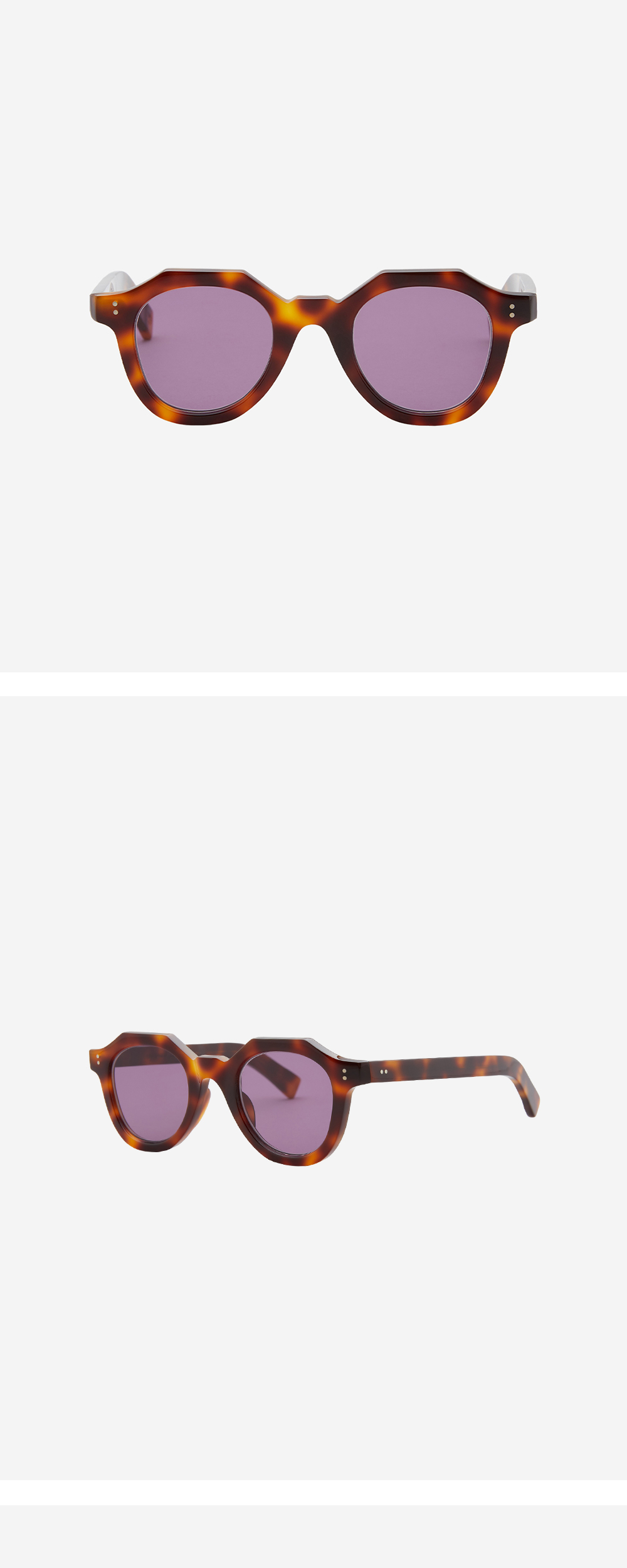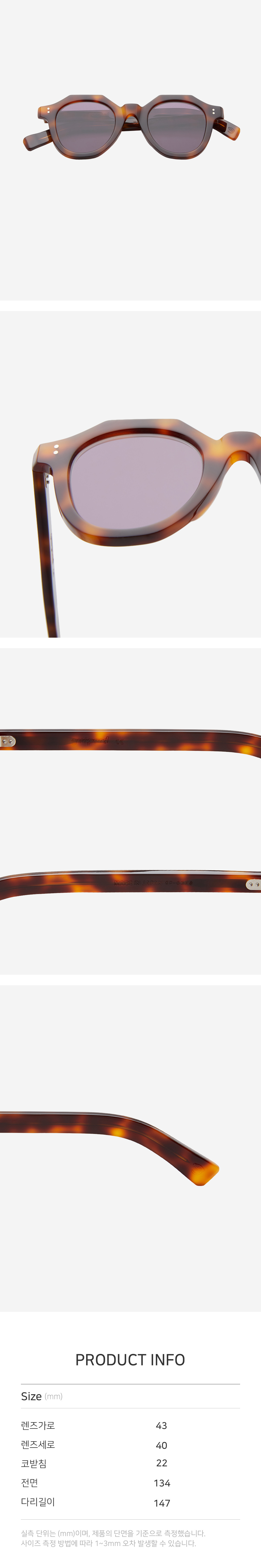 프렌치 빈티지의 대표적인 모델로 1940~50년대에 흔히 볼수 있는 크라운 판토 스타일의 안경이테지만 림 쉐입은 웰링턴형에 가까운 아방가르드한 디자인이 특징입니다. Lenses of guepard eyewear 빈티지한 느낌의 프레임이 좋은 이유는 선글라스로 착용해도 이질감이 전혀 없기 때문입니다. 빛에 쉽게 반사되었던 당시(1940~50년대 프렌치 방식) 렌즈의 단점을 보완하기 위해 커브가 전혀 없는 후면 멀티 코팅 플랫 렌즈를 사용하였고 단순한 복각을 넘어 그동안 볼 수 없던 컬러 베리에이션을 표현해냈습니다.