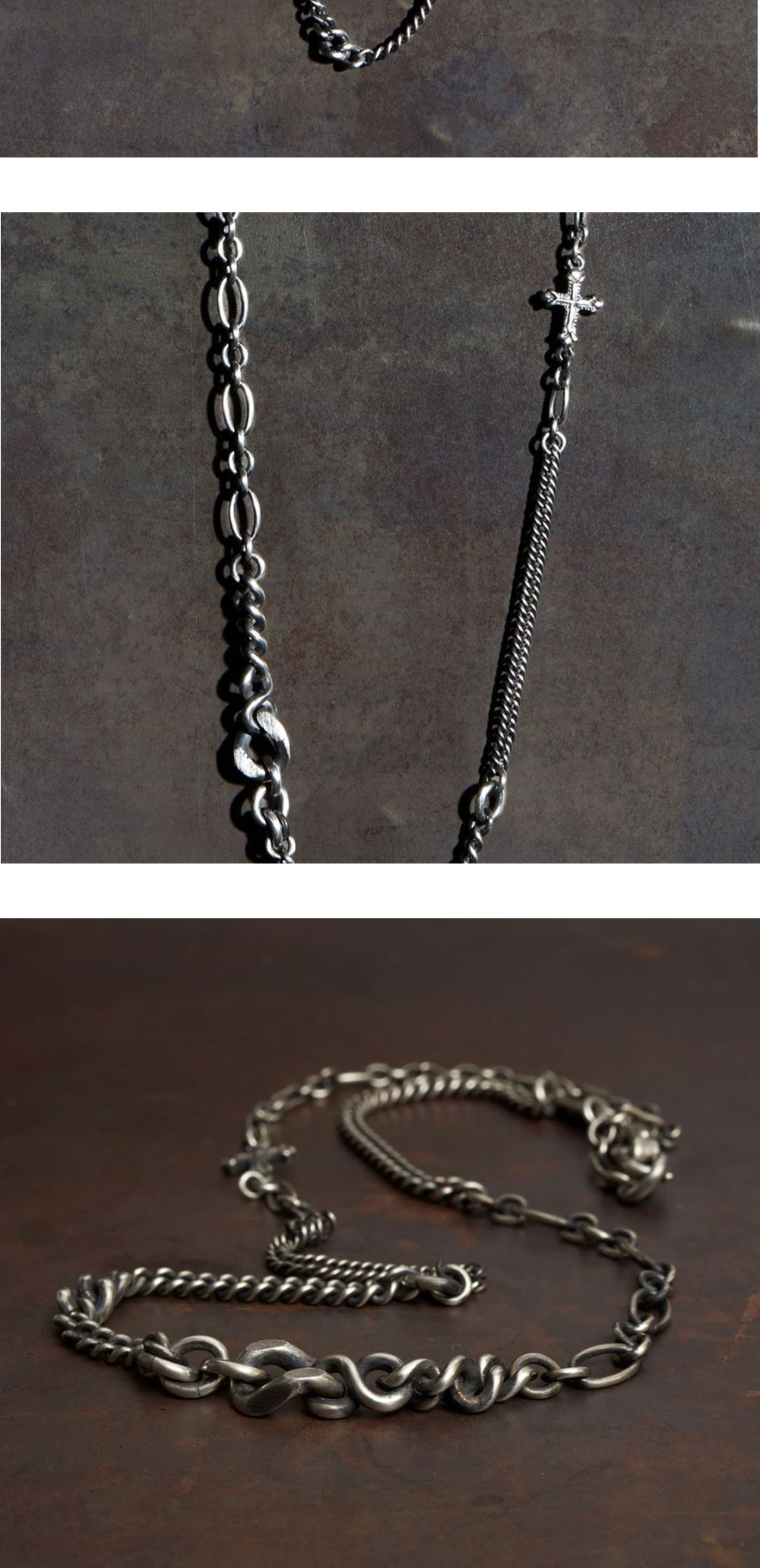 베르크슈타트 뮌헨 초커 페이스 러브 호프 실버 입니다. - 다양한 디자인의 체인과 고리 조합 - 하단에 십자가, 태그, 닻 펜던트 디테일 - 태그 전면 불타는 심장 각인 - 토글 바 형태의 잠금 장치