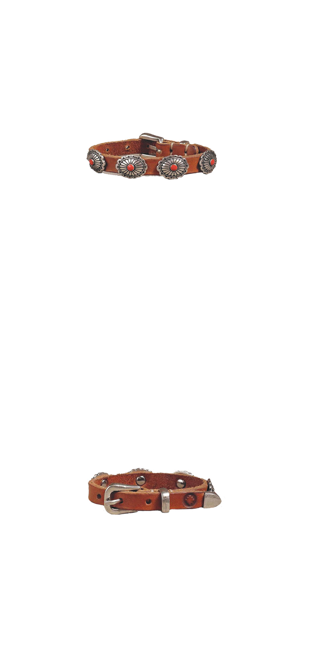 러스트 무드 55U 0027 브레이슬릿 23-03 네추럴 입니다. - 밝은 베이지 톤의 가죽 스트랩이 돋보이는 브레이슬릿 - 정교한 꽃무늬 각인이 새겨진 실버 톤의 콘초 장식 디테일 - 콘초 중앙에 박힌 터키석 포인트가 시각적 강조 효과 - 이탈리아 장인의 핸드메이드 공정을 거친 빈티지한 마감 처리