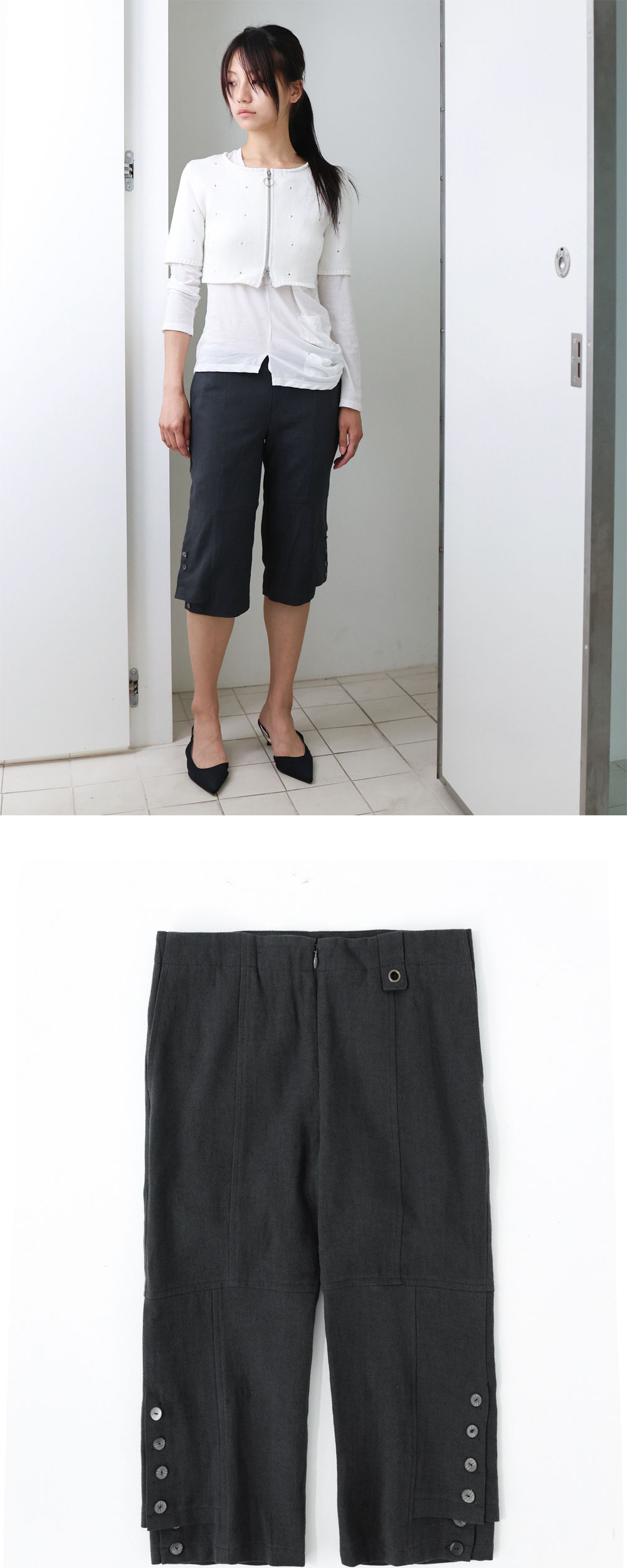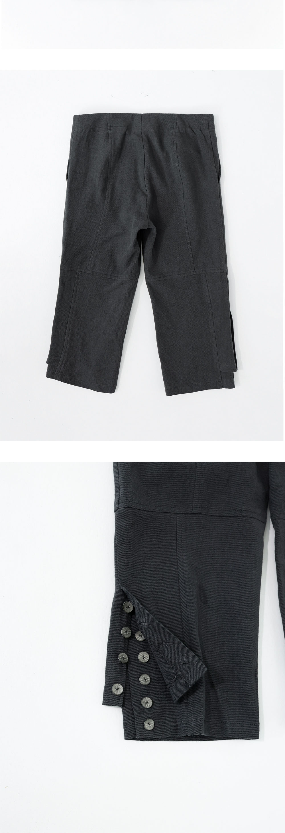 울리카 상투스 우먼 더블 레이어드 크롭 팬츠 차콜입니다. - 슬림핏 팬츠 - 하단 사이드 레이어드 패널 - 하단 사이드 버튼 디테일 - 리넨 혼방 원단으로 가벼운 착용감 * 모델 스펙: 166cm S 사이즈 착용