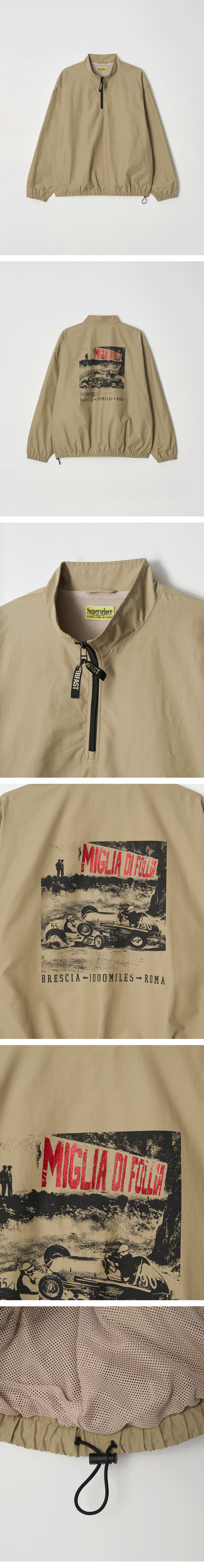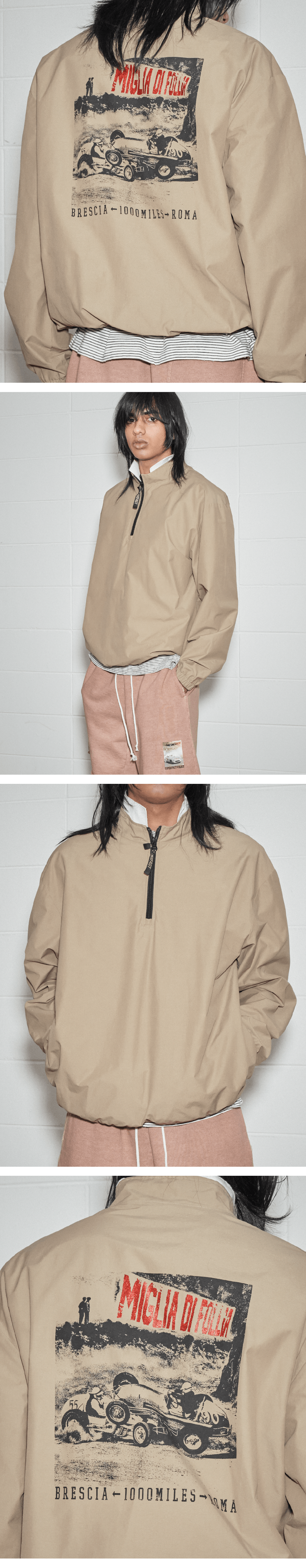 Phase 3 : Miglia di Follia 세상에서 가장 아름다운 광기 어린 레이스 윈드브레이커 타입으로 스포티하게 해석된 쿼터 집업 자켓으로, 광기 어린 레이스를 표현한 그래픽 위에 더해진 레드 글리터가 조용하게 강렬한 제품입니다. + 윈드브레이커 타입의 쿼터 집업 자켓 + 자연스러운 실루엣과 활동성을 고려한 스포티한 어깨 패턴 + 내추럴한 스타일링이 가능한 쿼터 집업 + 등판 실크스크린 프린트와 글리터 디테일 + 밑단 조임을 조정할 수 있는 이중 스트링과 스토퍼 장치 + 쾌적함을 유지해 주는 메시 안감 + 겉감 : Cotton 53%, Nylon 47% 안감 : Polyester 100% + Made in Korea + 모델(178cm) 착용 사이즈 L