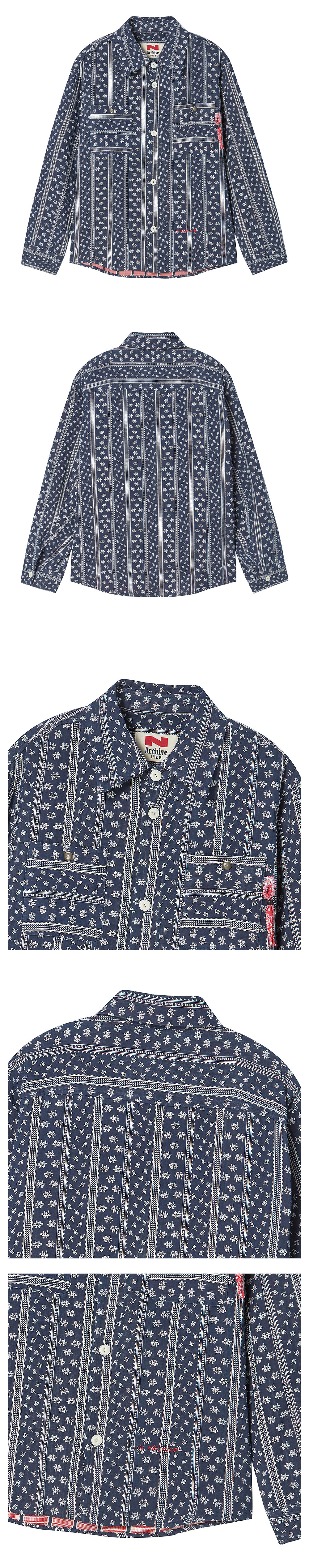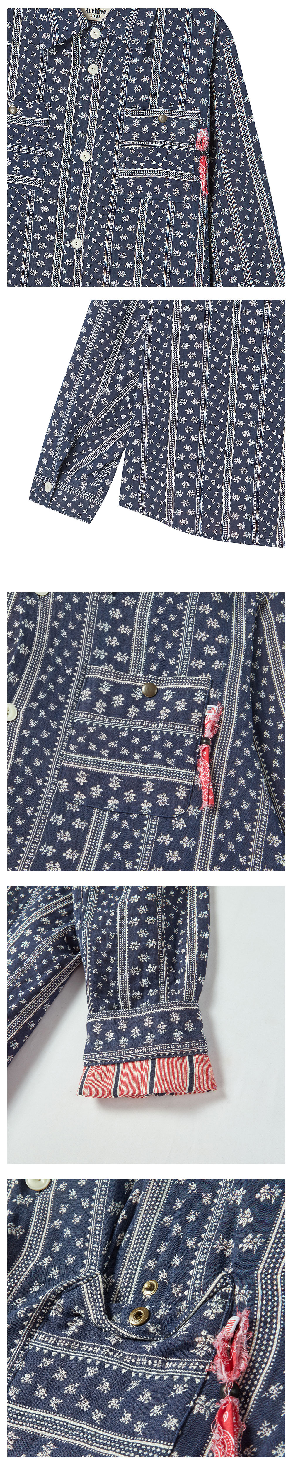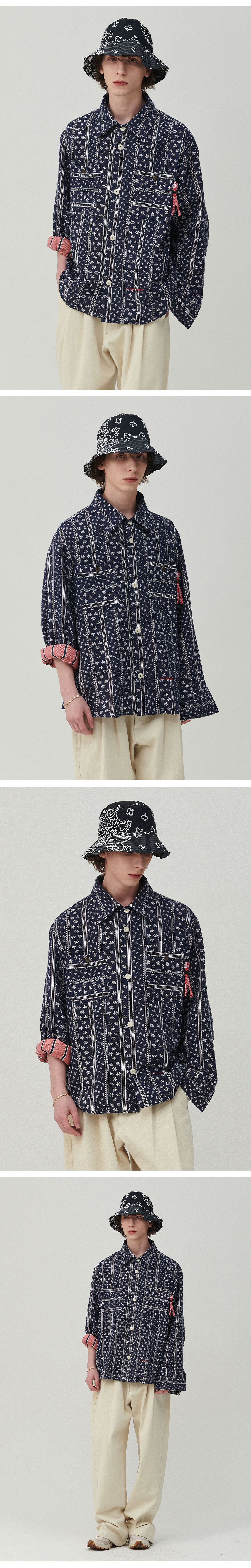 ㆍ직접 제직한 반다나 풍 패턴의 거즈 형태 4중지 코튼 원단으로 제작된 셔츠형 자켓 ㆍ가볍지만 레이어가 있는 이중지 구조로 자연스러운 볼륨감과 깊이감 있는 텍스처 구현 ㆍ거즈 특유의 부드럽고 유연한 터치감으로 간절기 아우터로 활용도 높은 아이템 ㆍ컬렉션 무드가 느껴지는 아트워크 패턴으로 단독 착용만으로도 스타일 완성 ㆍ가슴 부분에 YKK 빈티지 스냅을 사용해 내구성과 디자인 완성도 강화 ㆍ레드 컬러 반다나 스트링 디테일로 위트 있고 감각적인 포인트 연출 ㆍ소매를 롤업하거나 탈의 시 드러나는 대비 컬러 안감으로 숨겨진 유니크함 강조 ㆍ셔츠처럼 가볍게, 자켓처럼 구조감 있게 연출 가능한 하이브리드 실루엣 ㆍ유니섹스 제품으로 제작되었으며, 세미오버 핏으로 제작, 여성 고객님께는 M 사이즈 추천