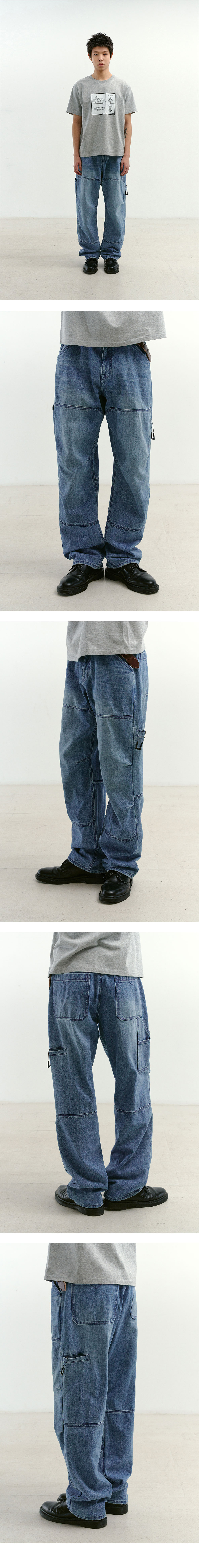 Incision Double Knee Carpenter Pants (Washed Blue) 무릎 부분의 패턴을 더블니가 아닌 절개로 제작하여 포인트를 준 데님 팬츠입니다. 12oz 데님 원단을 사용하여 오랜 시간 착용하여도 변형이 적은 특징을 가지고 있습니다. 캣브러시 워싱으로 데님 원단에 자연스러운 깊이감을 더했습니다. SPECIFICATION - Cotton 100% -12oz 데님원단 - 캣브러시 디테일· 워싱 - 절개 더블니·무릎 입체 다트 - 슬래시·코인 포켓 - 후면 웰터· 카펜터 해머 포켓 179cm, 58kg / 32size