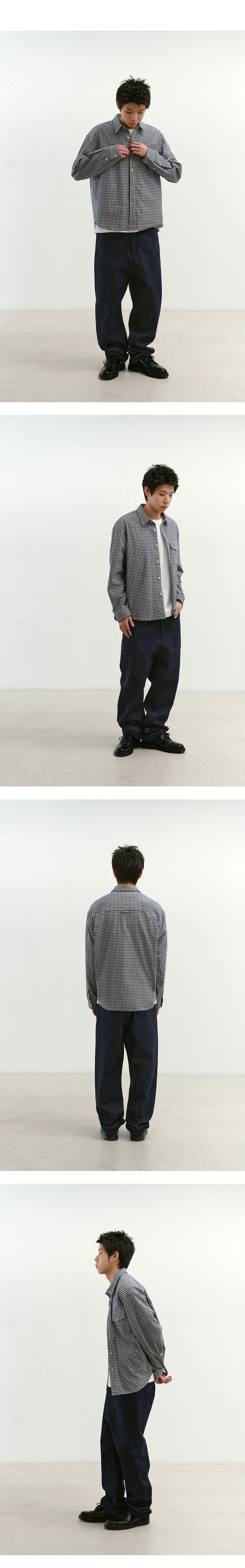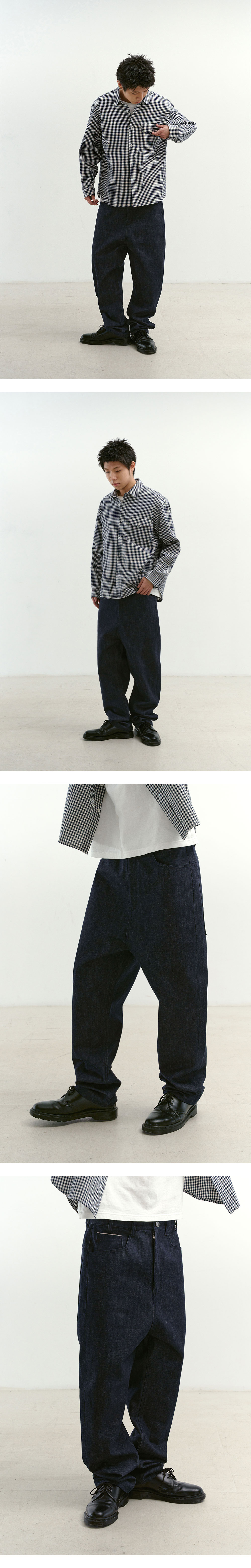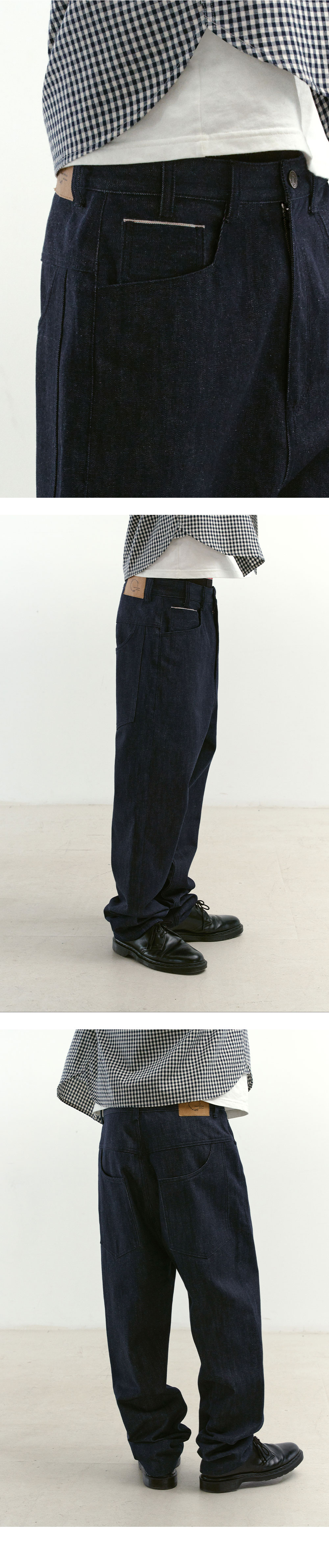 Natural High Waist Baggy Fit Selvedge Denim Pants(Navy) 의도적으로 밑위를 길게 설정해 갈비뼈 아래부터 엉덩이까지 감싸는 핏의 데님 팬츠입니다. 착용 위치에 따라 다양한 실루엣 연출이 가능합니다. 12oz 셀비지 데님 원단을 사용해 형태가 안정적으로 유지되며, 논워싱 특유의 자연스러운 페이딩을 경험할 수 있습니다. 사이드와 코인 포켓에 더해진 레드 스티치 디테일이 포인트가 됩니다. SPECIFICATION - Cotton 100% -12oz 셀비지 데님 - 레드 스티치 포인트 - 긴 밑위 기장 - 5포켓 - 논워싱 처리 179cm, 58kg / 32size