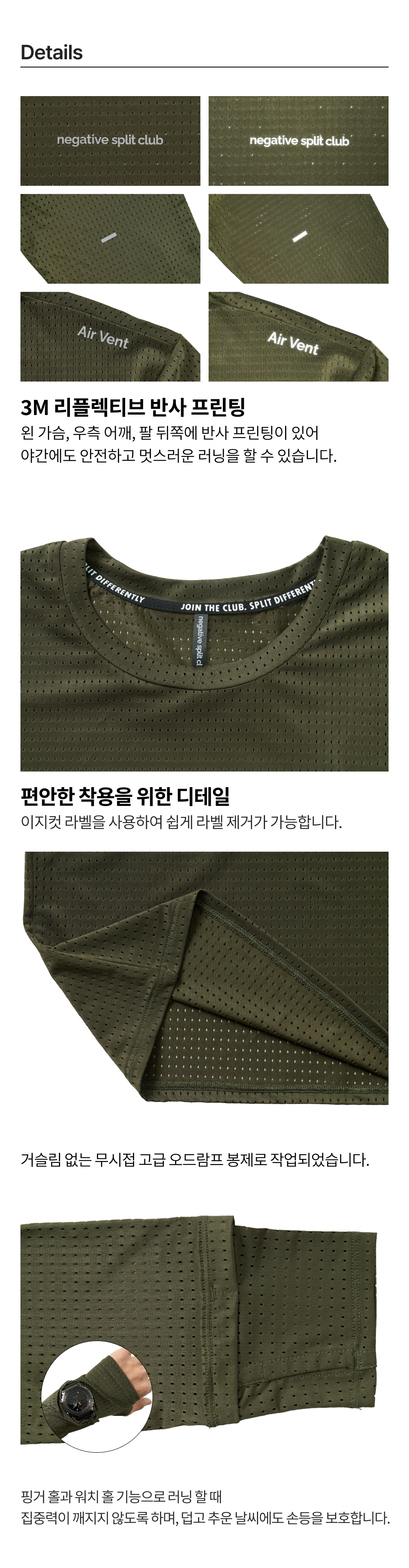 네거티브 스플릿 클럽 에어벤트 솔리드 핑거 워치홀 롱슬리브 카키
