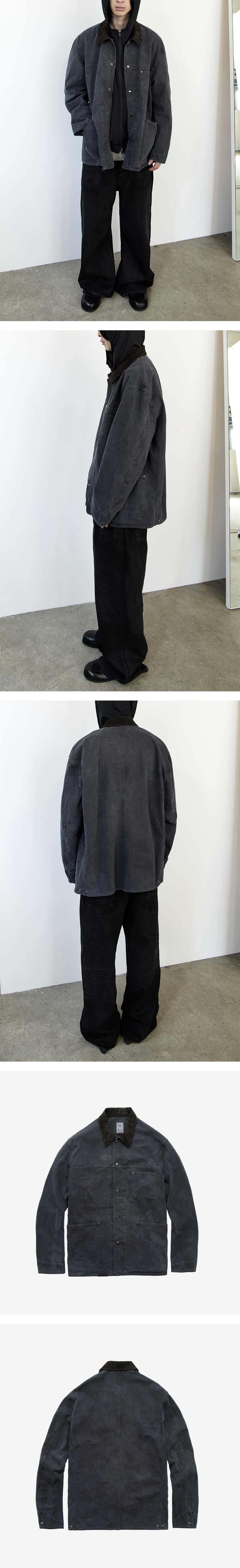 aged balloon coverall - washed blue -간절기에 착용하기 좋은 커버올 형태의 중기장 아우터 -몸판과 대비되는 스웨이드 소재 카라 적용 -러프한 외관과 대비되는 부드러운 터치감 -전면부 스냅 형식 여밈 구조 -전면부 포켓 리벳 디테일 -밑단 빈티지 패브릭 테이프 디테일 -사이드 스냅 어드저스트 적용 *모델: 178cm / 마른 체형, 3사이즈 착용