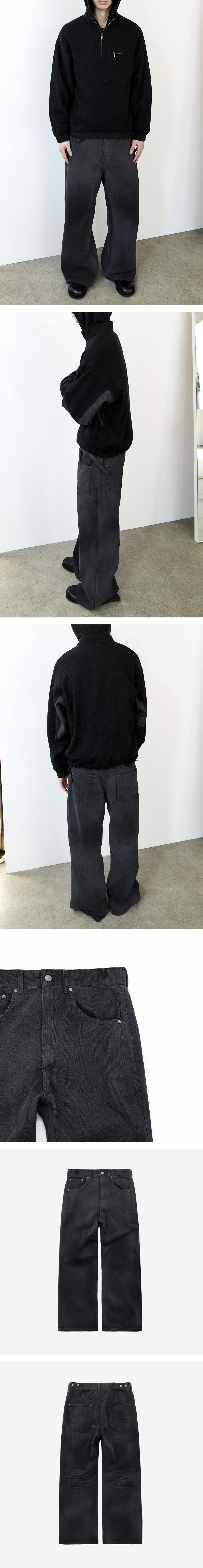 loosed coated jeans (matt coated) 빈티지한 워싱감의 5P 블랙 진 베이스로, 코팅 가공을 적용해 자연스러운 러스터함을 살린 팬츠 클래식한 실루엣에 입체적인 후면 링클 디테일 및 부분적으로 적용된 코팅을 적용하여, 이지한 품목부터 디테일이 강한 아이템과도 자연스럽게 어우러지는 밸런스를 완성 (matt coated) 버전은 매트한 코팅을 적용해 은은한 페이딩 콘트라스트가 특징입니다. 후면 포켓은 절개 및 리벳 디테일이 특징적이며, 허리 양 사이드에 어드저스트 적용하여, 다양한 연출이 가능하도록 완성했습니다. - 클래식한 형태의 5P 데님 팬츠에 부분 코팅 적용 - 빈티지한 워싱감 - 후면 포켓 절개 및 리벳 디테일 - 입체감을 살린 후면 링클 디테일 - 허리 사이즈 조절 가능한 사이드 어드저스트 *모델: 178cm, 마른 체형 / 3사이즈 착용