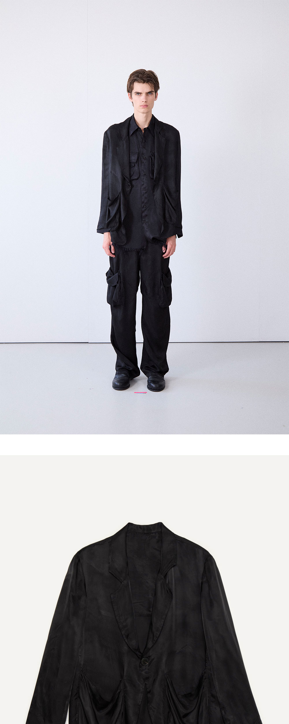 에드워드 커밍 새그 블레이저 블랙입니다. - 아래로 자연스럽게 쳐지는 새그 실루엣 - 가볍고 유연하게 떨어지는 드레이프 피트 - 에드워드 커밍만의 독창적인 해체주의 디테일