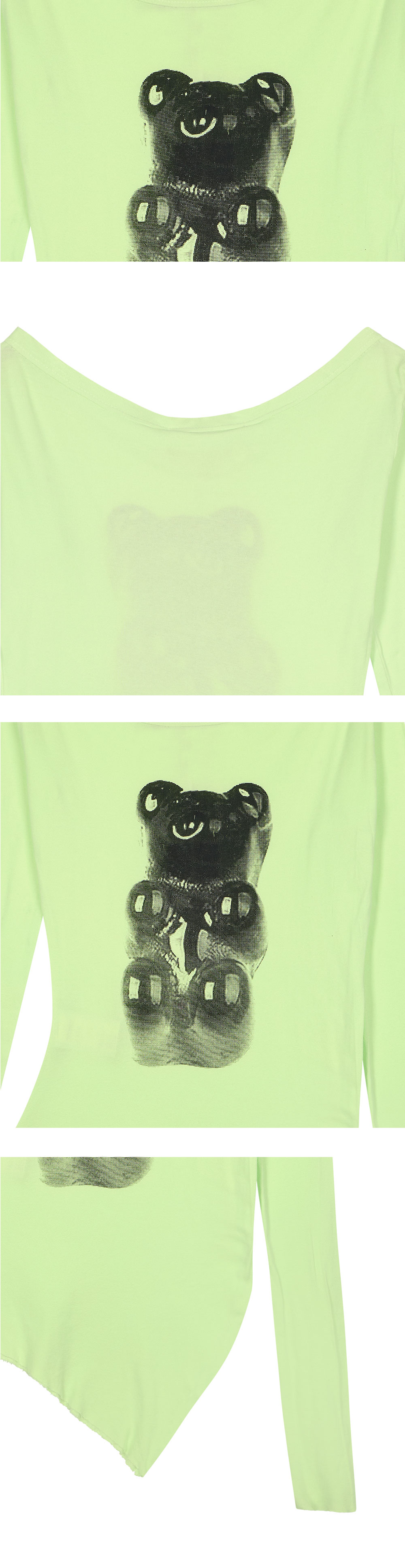 에드워드 커밍 검 바나나 탑 워시드 그린 입니다. - 전면 중앙의 블랙 컬러 베어 그래픽 프린트 - 비대칭으로 커팅된 하단 헴라인 디테일 - 넓게 파인 보트넥 라인 디자인 - 워시드 가공이 들어간 연한 그린 컬러감