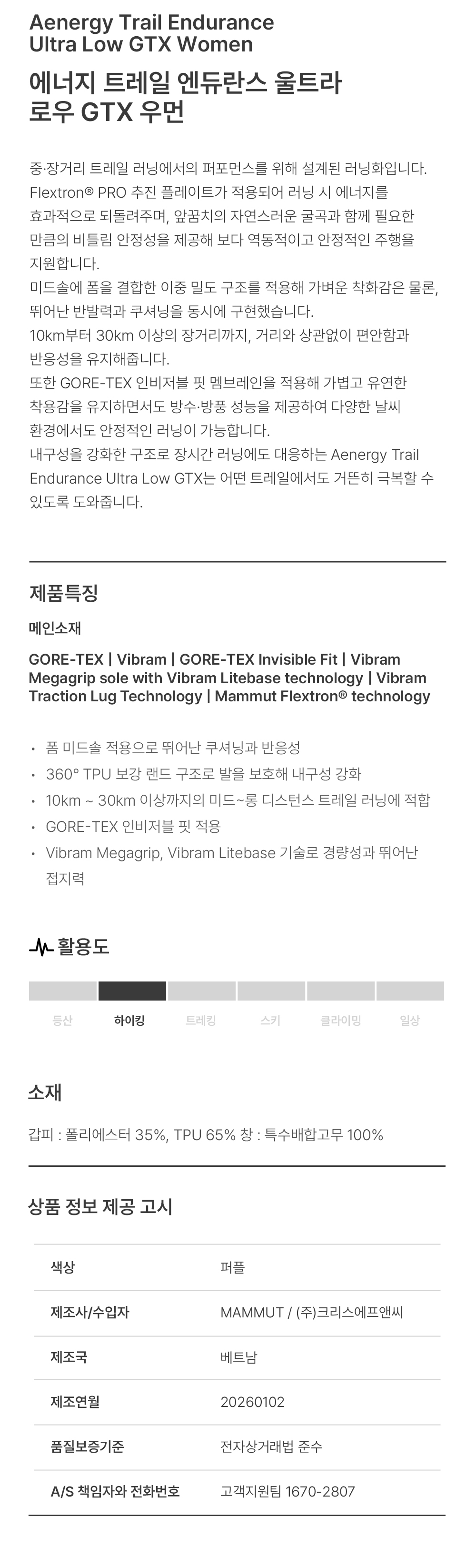 마무트 에너지 트레일 엔듀란스 울트라 로우 GTX 우먼 퍼플
