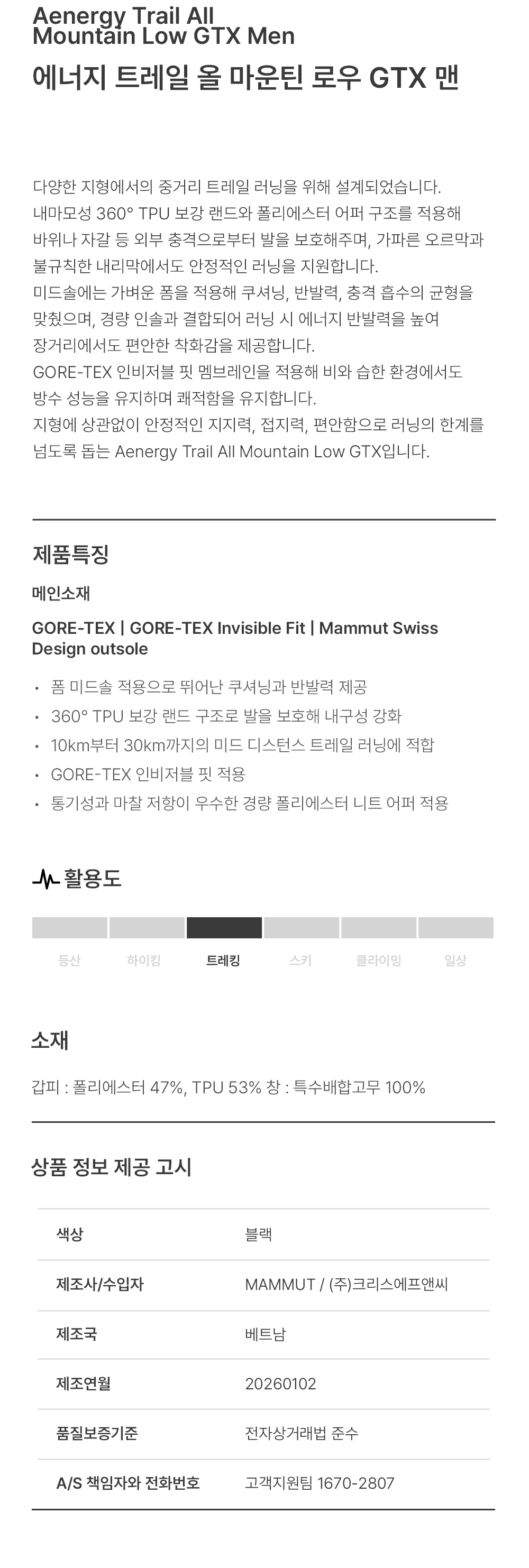 마무트 에너지 트레일 올 마운틴 로우 GTX 맨 블랙