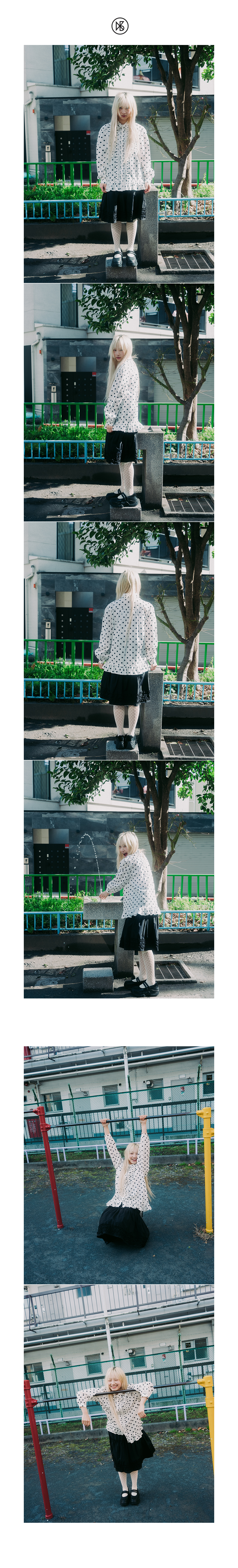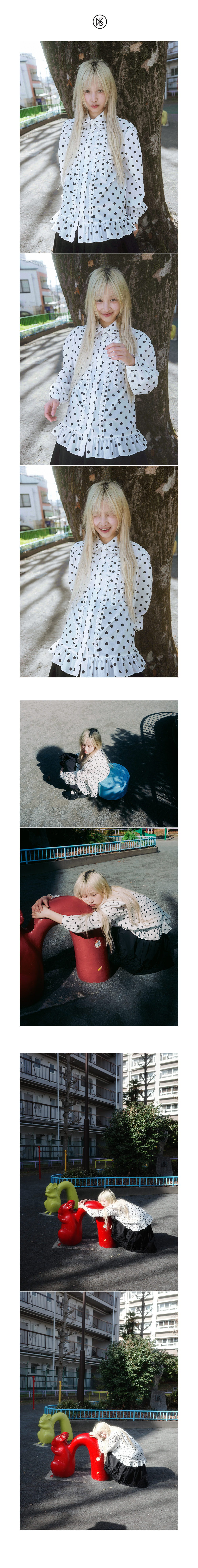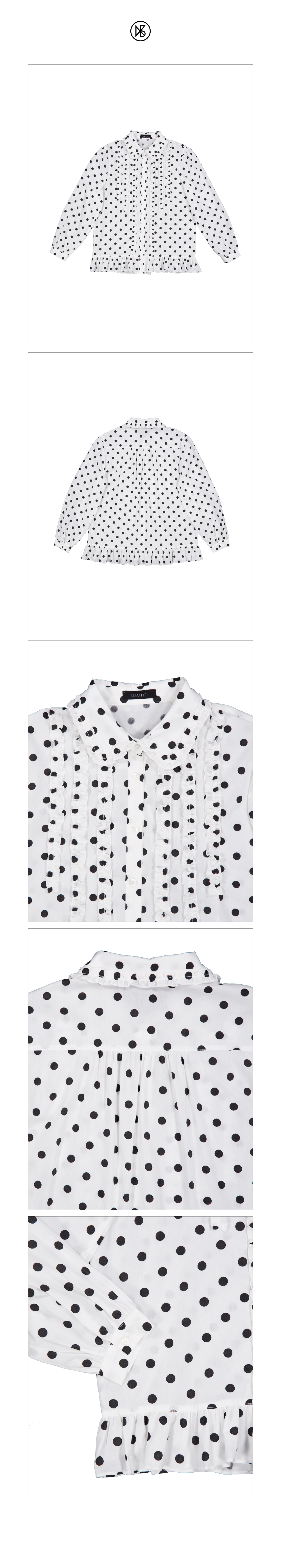 Blair Dot Blouse FABRIC Cotton 100% DETAIL -둥근카라에 제원단 프릴 덧방 -어깨와 뒷판 요크 아래 셔링 -소매 카오스 위 셔링 -밑단 러플 디자인 -리얼 자개단추 -앞판 제원단 프릴 디테일 SIZE -원사이즈 총장 70cm, 가슴 52cm , 어깨 39.5cm, 소매장 61.5cm *같은 제품이라도 재는 위치에 따라 오차가 있을 수 있습니다* *해상도에 따라 화면에서 보이는 것과 색감차이가 날 수 있습니다. * WASHING INSTRUCTIONS -건조기금지 -드라이크리닝 MODEL Dudu, Height 159cm