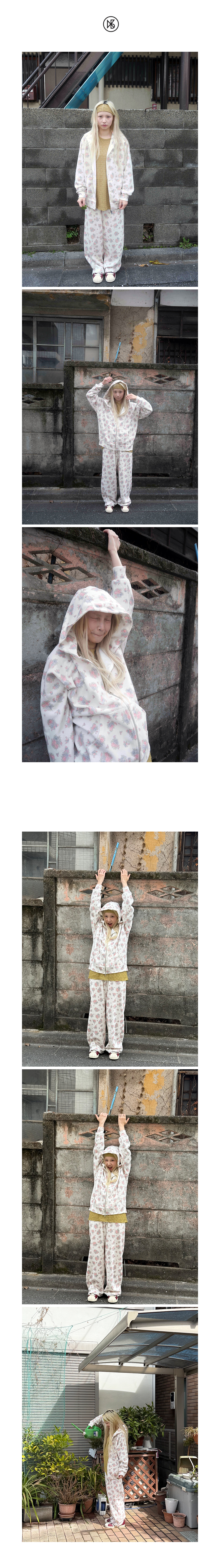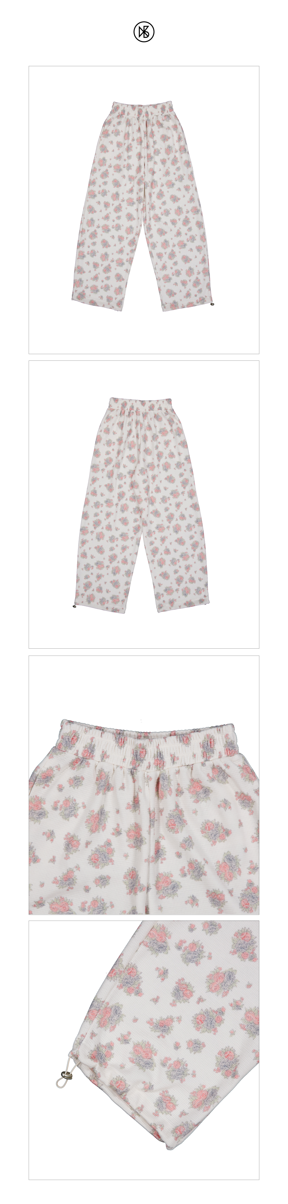 Flower Waffle Jogger Pants FABRIC Polyester 50%, Cotton 50% DETAIL -플라워 패턴의 와플 조직 원단 -와이드한 핏이며 밑단으로 가면서 둥글게 좁아지는 디자인 -허리 전체밴딩 -사이드포켓 있음 -밑단 스트링,스토퍼로 조절 가능 SIZE -원사이즈 총장 103cm, 허리단면 31cm(밴딩), 힙 52cm 허벅지 33cm, 밑위 28cm, 밑단 26cm *같은 제품이라도 재는 위치에 따라 오차가 있을 수 있습니다* *해상도에 따라 화면에서 보이는 것과 색감차이가 날 수 있습니다. * WASHING INSTRUCTIONS -건조기금지 -드라이크리닝 MODEL Dudu, Height 159cm