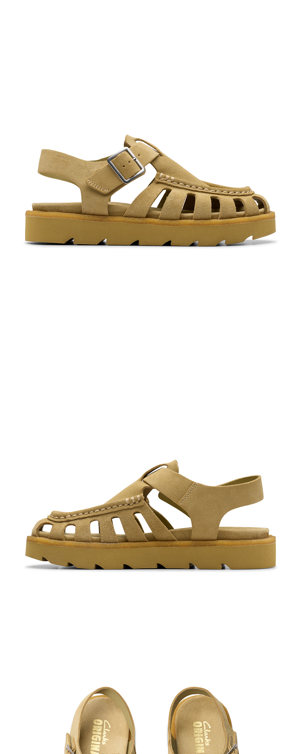 클락스 우먼 메어 버클 다크 메이플 스웨이드 입니다. - 왈라비에서 영감을 받은 피셔맨 샌들 실루엣 - 깊이감 있는 다크 메이플 컬러의 프리미엄 스웨이드 갑피 - 발등의 조절 가능한 버클 스트랩 포인트 - 가볍고 쿠션감이 뛰어난 초경량 EVA 솔 적용