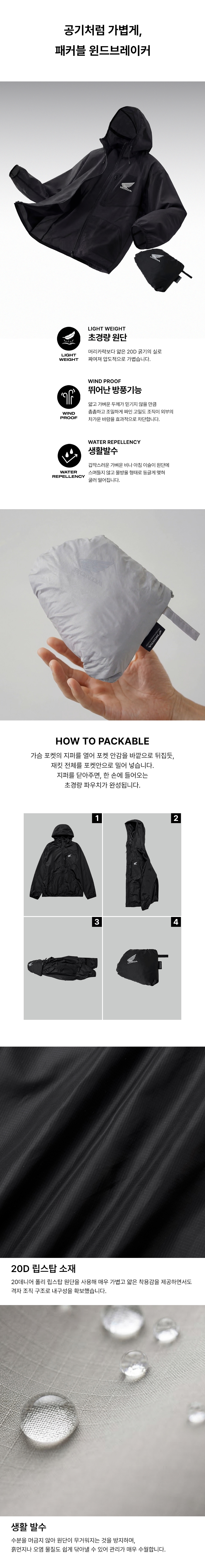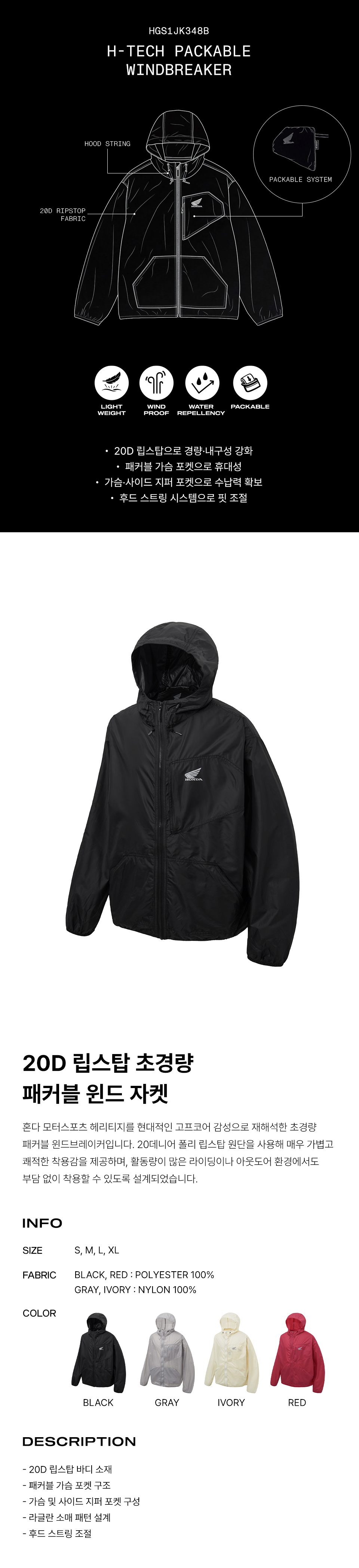 혼다 H-Tech 패커블 윈드브레이커 솔리드 버전 블랙