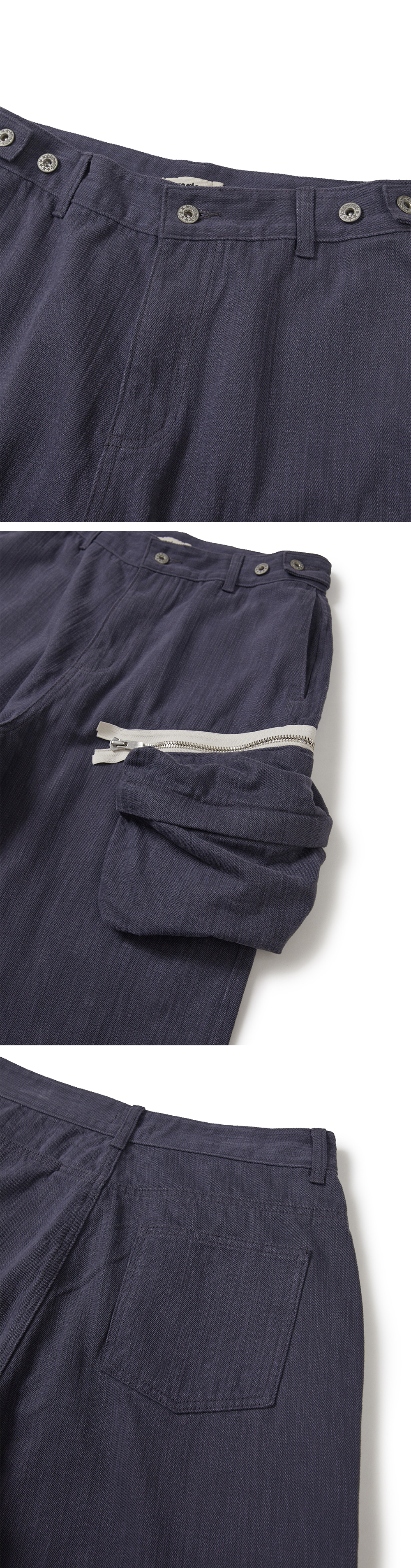 Product Info. - 자연스러운 텍스처의 고밀도 카치온 코튼 원단으로 제작된 트라우저 - 복합 워싱 가공을 통해 내추럴하고 소프트한 터치감 - 릴렉스드 핏 테이퍼드 실루엣으로 편안한 착용감 - 벨트라인 양 사이드 버튼 어드저스터로 허리 사이즈 조절 가능 - 측면 탈착 가능한 파우치 디테일 - 파우치 YKK EXCELLA 지퍼 사양으로 높은 완성도와 안정적인 개폐감