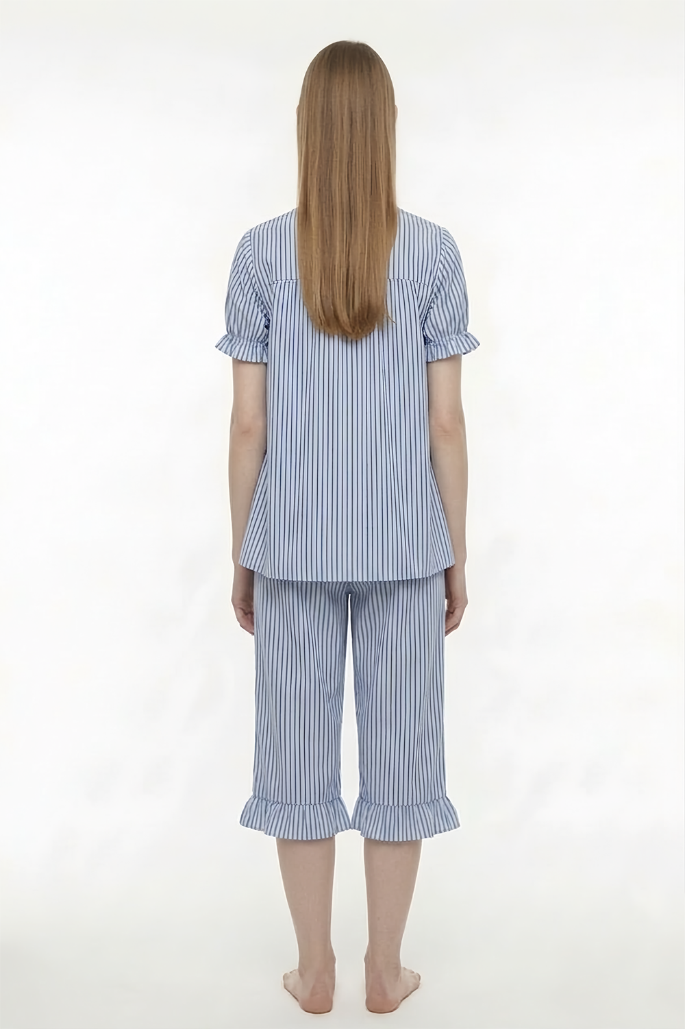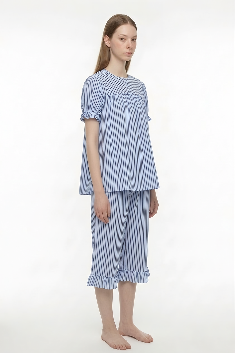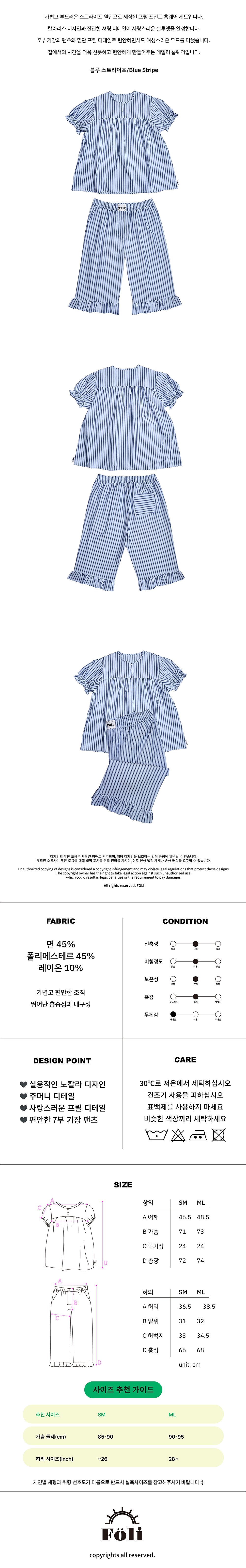 폴리 여 프릴 칼라리스 홈 카프리 세트, 블루 스트라이프