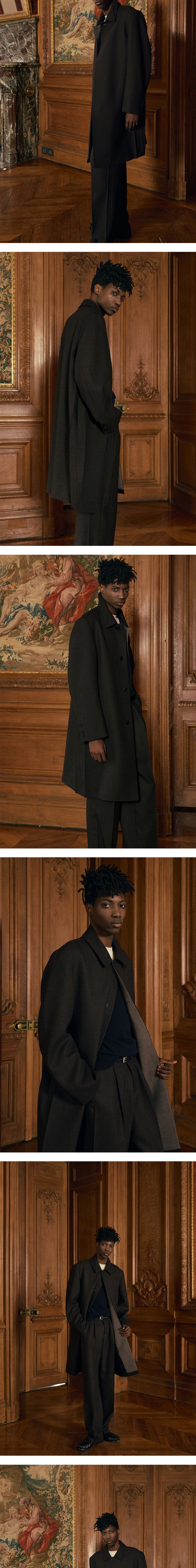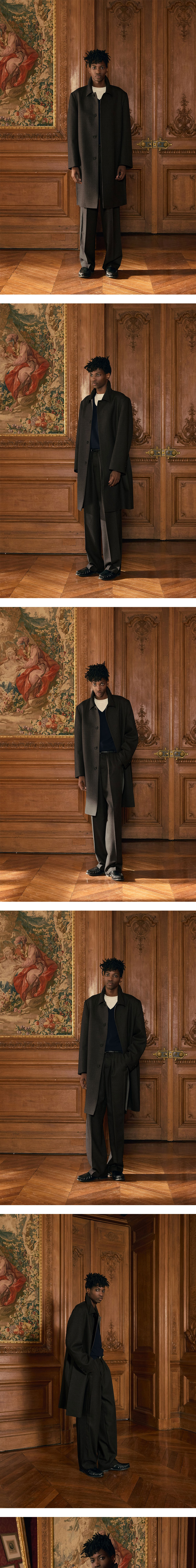 - 루즈 핏 - 배색 컬러 원단 - 카라, 몸판 크리즈 디테일 - 히든 버튼 플라켓 디테일 - 내부 배색 원단 디테일 - 로고 각인 단추