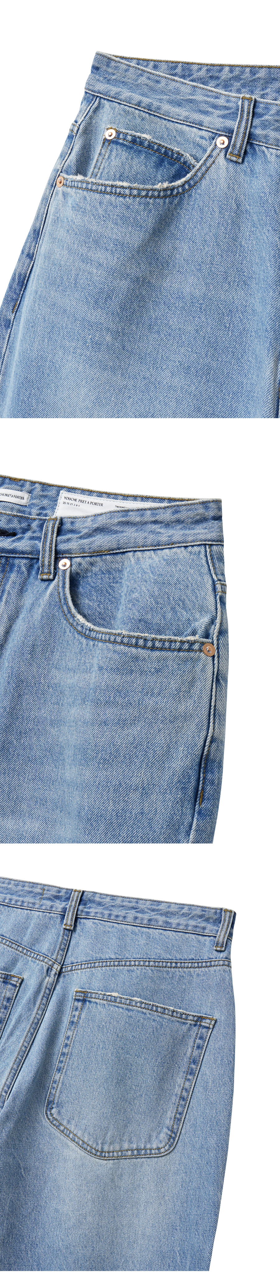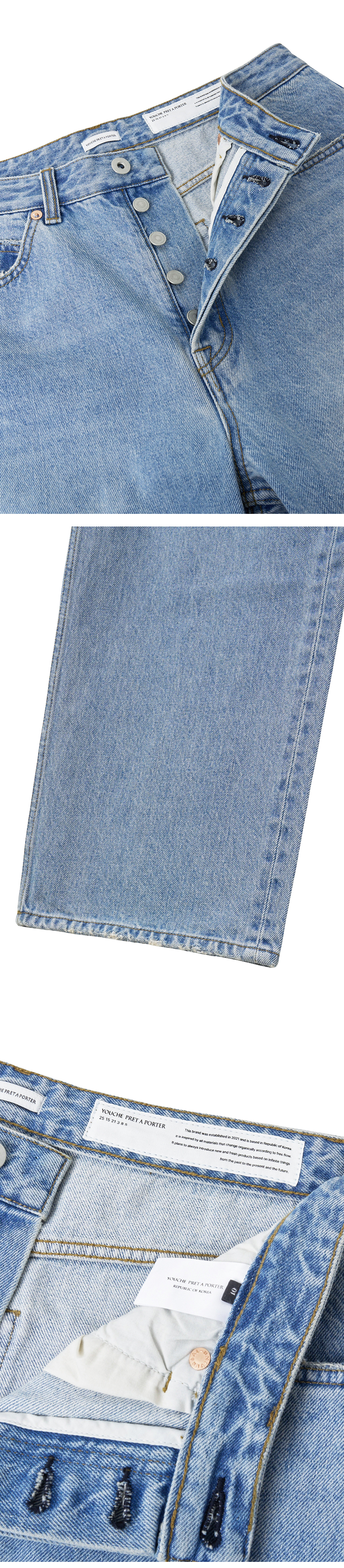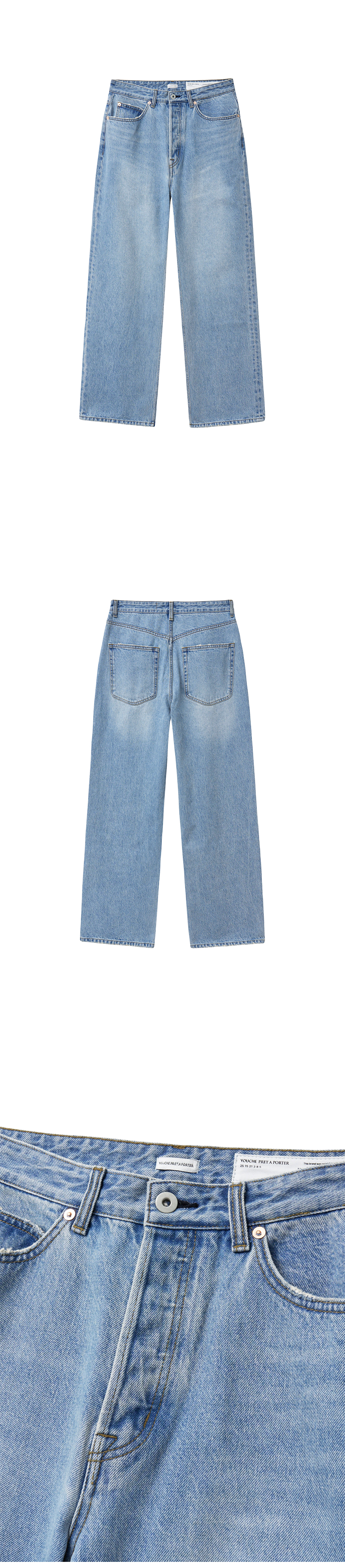 Material Outshell : Cotton 100% ( India Raymond社 Denim fabric ) Colour : Pure Blue - 13oz cotton 100% India Raymond社 denim fabric - 17mm YKK社 tack button - 9mm Universal社 copper-bronze rivets - Button fly closure - Subtle hand-brushed wash - Grinder distressing detail at pockets and hem - Rectangular label detail inside the waistband - Relaxed straight fit