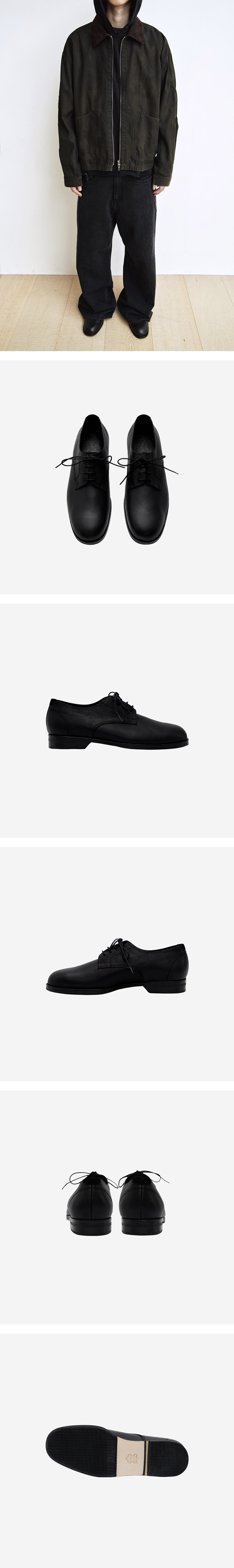 grain toe derby shoes 폴리테루 디자인 기조에 맞춰 새롭게 해석한 더비 슈즈. 기존 더비 슈즈의 날렵한 프론트 쉐입과 달리, 부드럽게 라운드진 토와 바닥에 자연스럽게 가까워지는 실루엣이 특징입니다. 보행 시 앞축이 발의 움직임에 맞춰 부드럽고 유연하게 꺾이며, 내부는 아치를 받쳐주는 입체 구조로 설계되어 가볍고 편안한 착화감을 제공합니다. *정사이즈 추천드립니다.