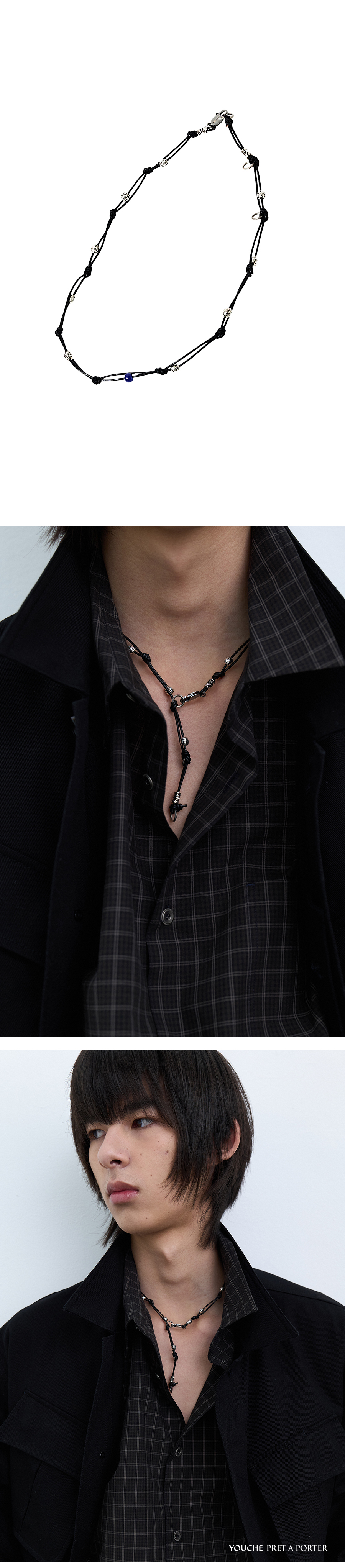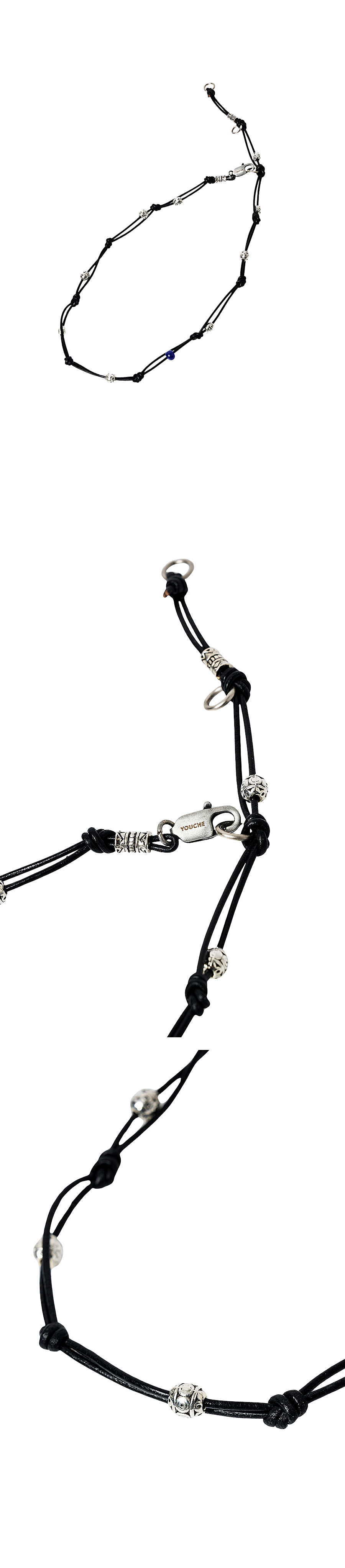 Material Strap : Cowhide leather 100% Beads : Brass 100% Colour : Obsidian Black - A cowhide leather strap with a subtle sheen - Knotted leather strap - A hook engraved with the YOUCHE logo - Blue ceramic bead detail - 3-way wearable necklace