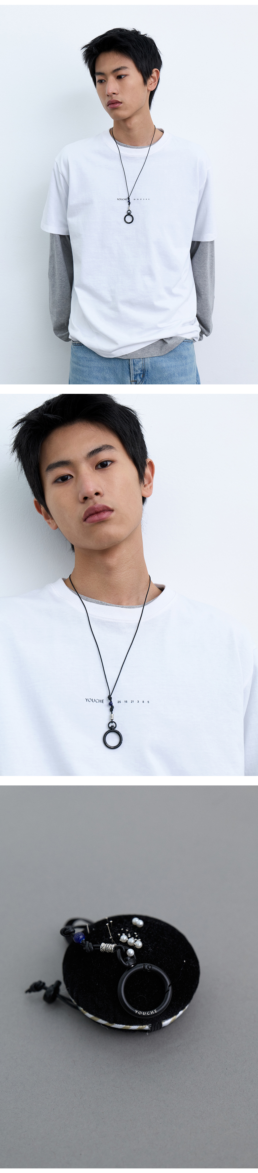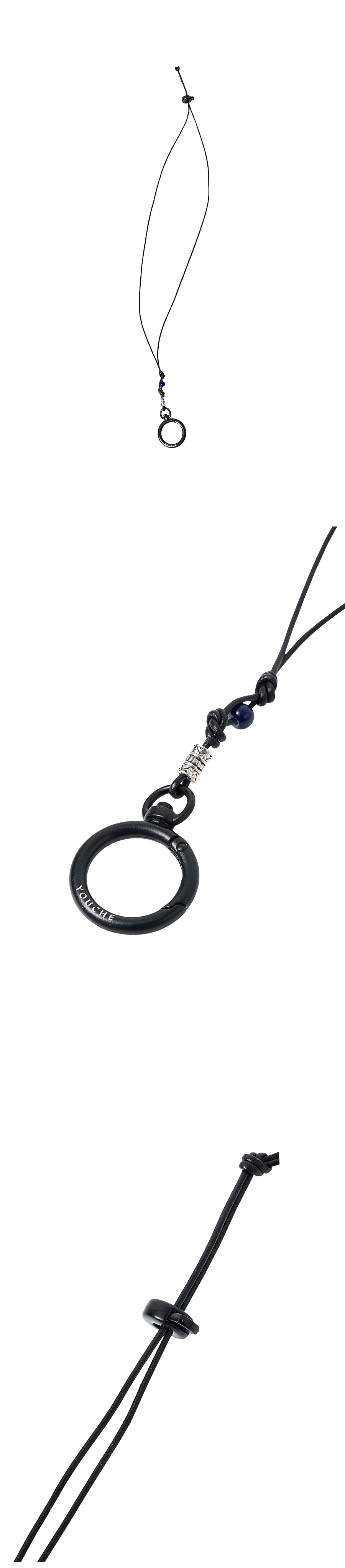 Material Strap : Cowhide leather 100% Hook : Iron steel 100% Colour : Black - A cowhide leather strap with a subtle sheen - Hook closure O-ring engraved with the YOUCHE logo - Adjustable length with stopper closure - Finished with beads details
