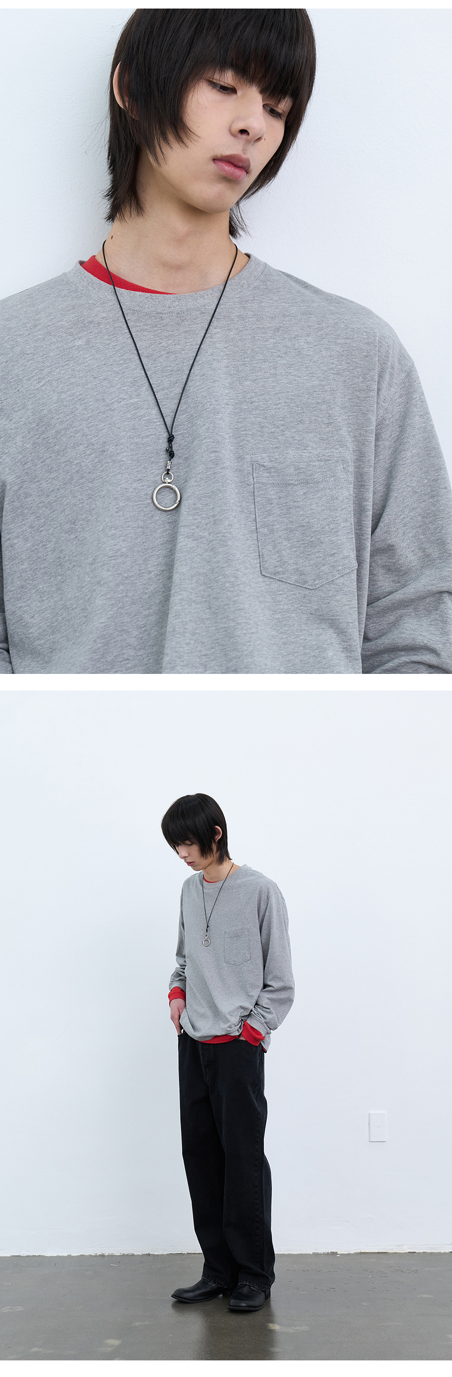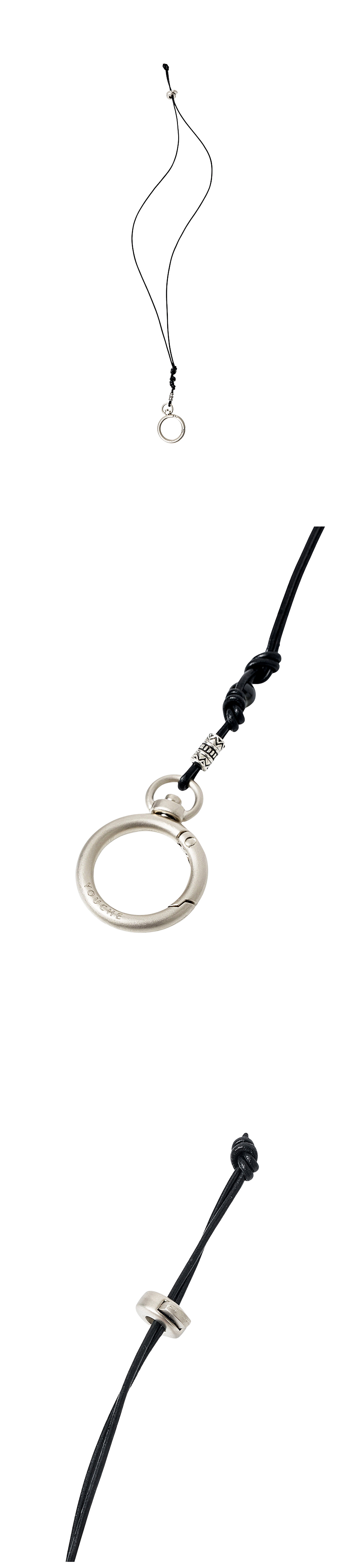 Material Strap : Cowhide leather 100% Hook : Iron steel 100% Colour : Silver - A cowhide leather strap with a subtle sheen - Hook closure O-ring engraved with the YOUCHE logo - Adjustable length with stopper closure - Finished with beads details