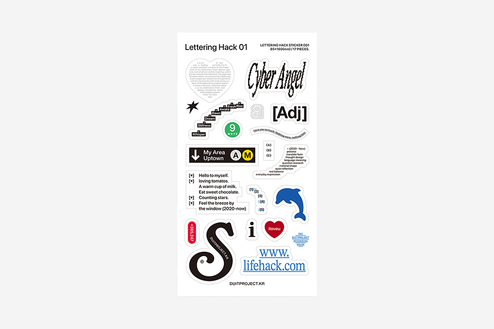 life hack'은 일상에서 유용하게 활용되는 작은 아이디어를 뜻합니다. 이 개념을 모티브로 'Scrap hack'을 선보입니다. 'Life hack이 삶의 꿀팁이라면, Scrap hack은 기록과 스크랩을 센스있게 완성해주는 Duitproject의 특별한 장치입니다. 페이지 위의 빈 여백을 채우거나, 생각의 포인트를 남길 때 사용해 보세요.