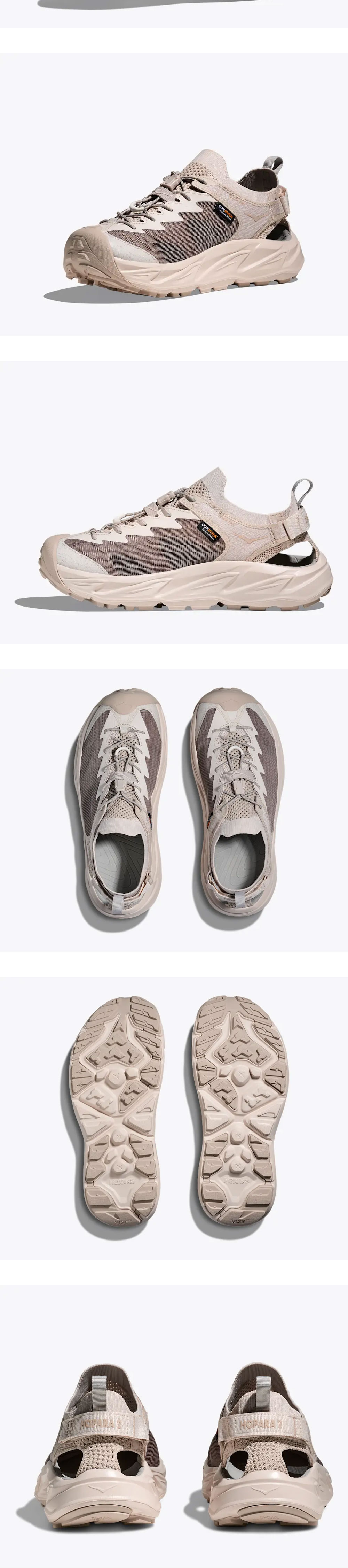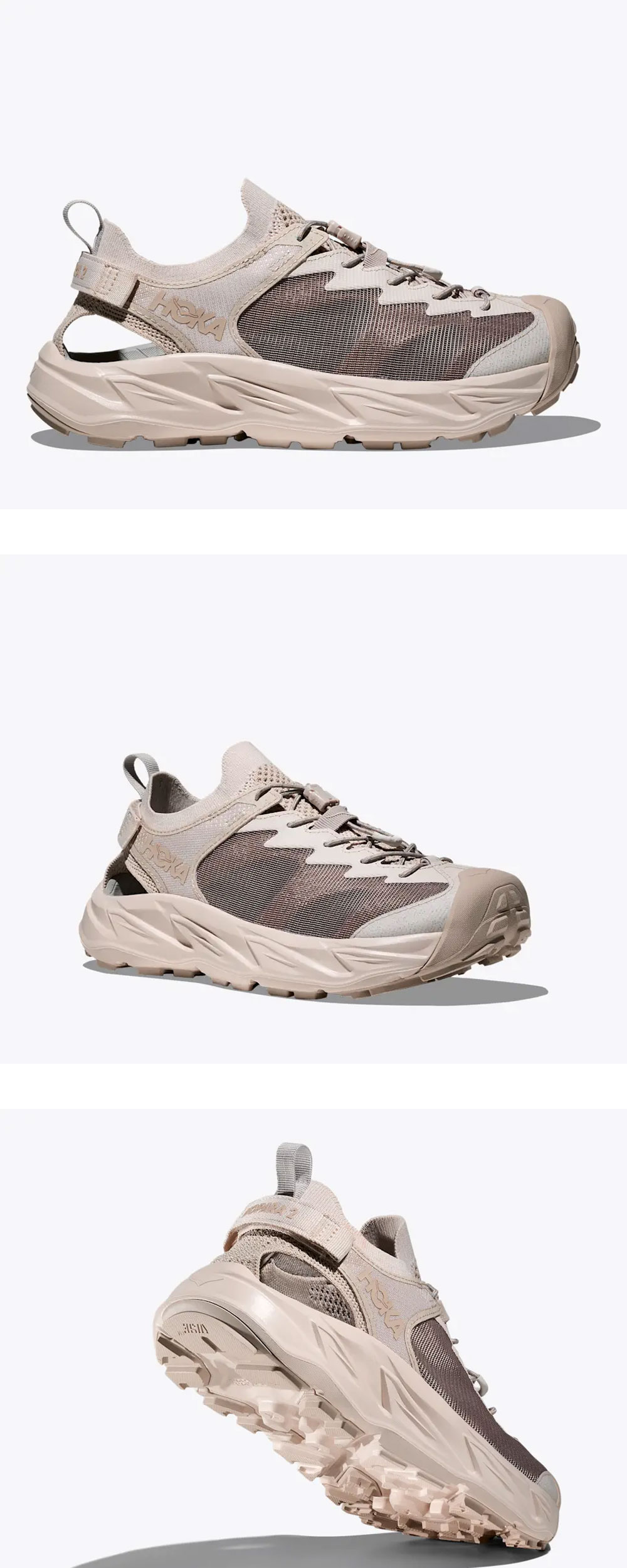 호카 호파라 2 스투코 퍼티입니다. - 샌들의 통기성과 등산화의 보호력을 결합한 디자인 - 끈을 묶지 않고 당겨서 조이는 토글 레이스 시스템 - 뒤꿈치를 단단히 고정해주는 벨크로 스트랩 - 물 빠짐이 빠르고 내구성이 강한 코듀라 메쉬 소재