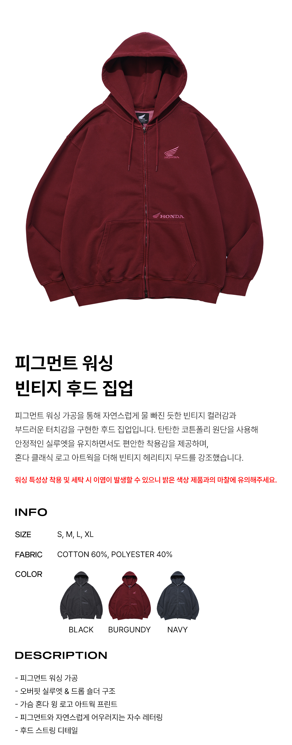 혼다 피그먼트 후드 집업 버건디