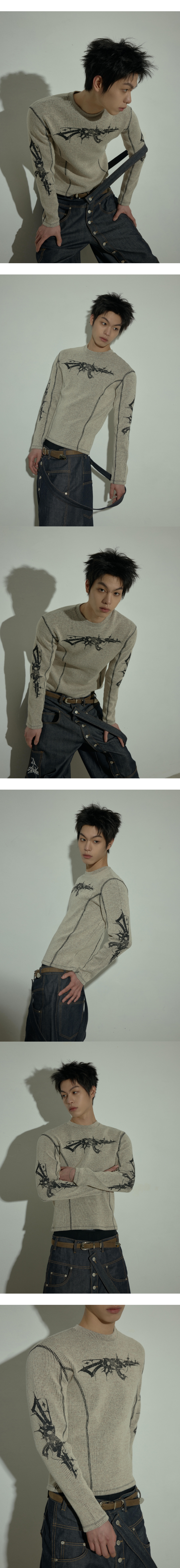 LAN ARCHIVE 0107 Gun Graphic Ribbed Slim Long Sleeve - Beige