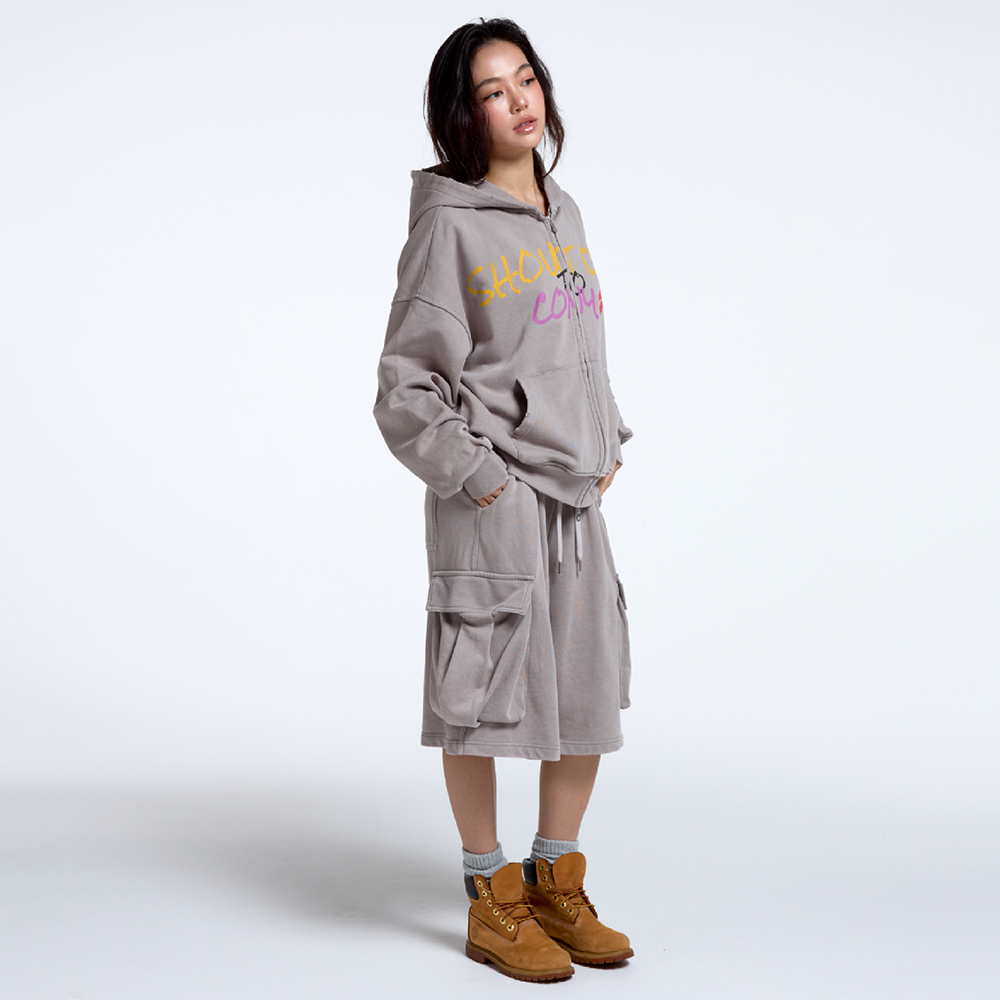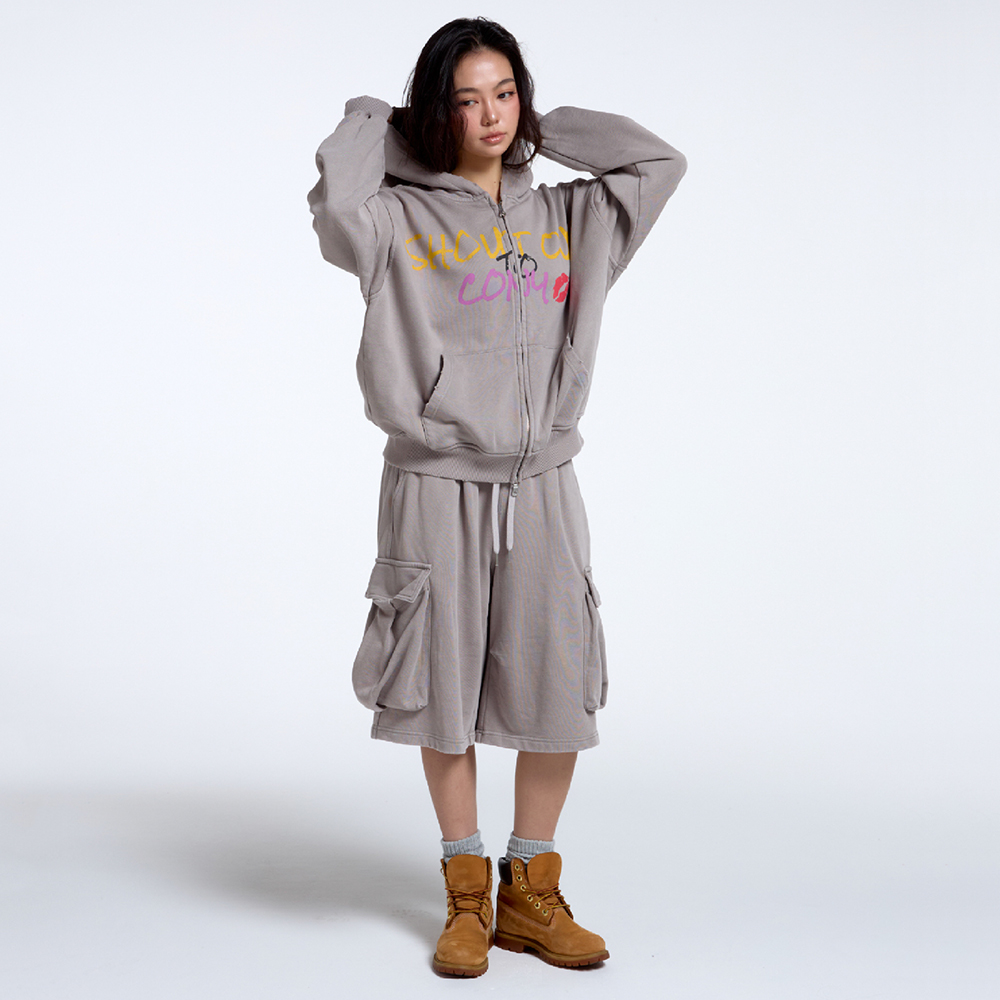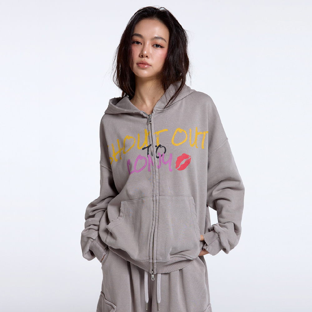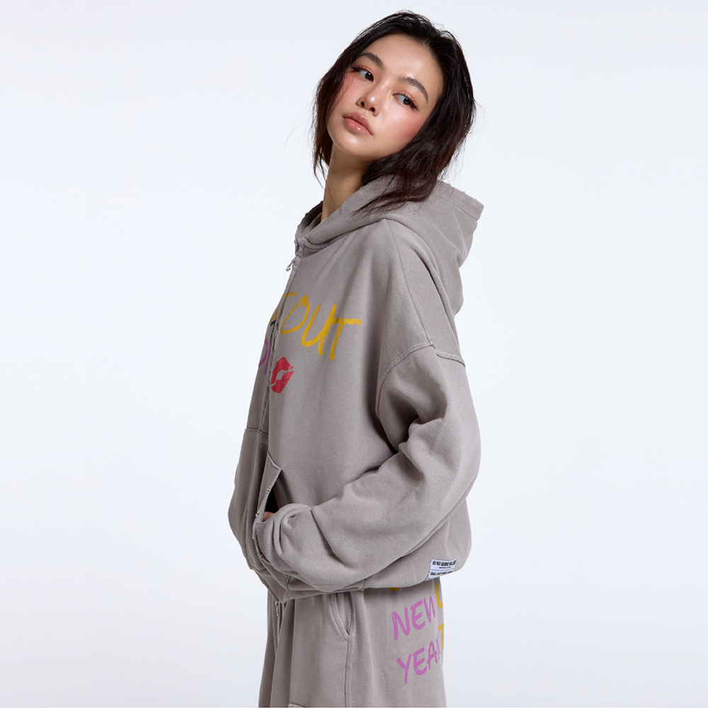 DETAIL -엑시드 워싱 가공 -전면 그래픽 나염 -후면 포인트 라벨 디테일 -YKK 투웨이 지퍼 사용 -이중 립 워머 슬리브 디테일