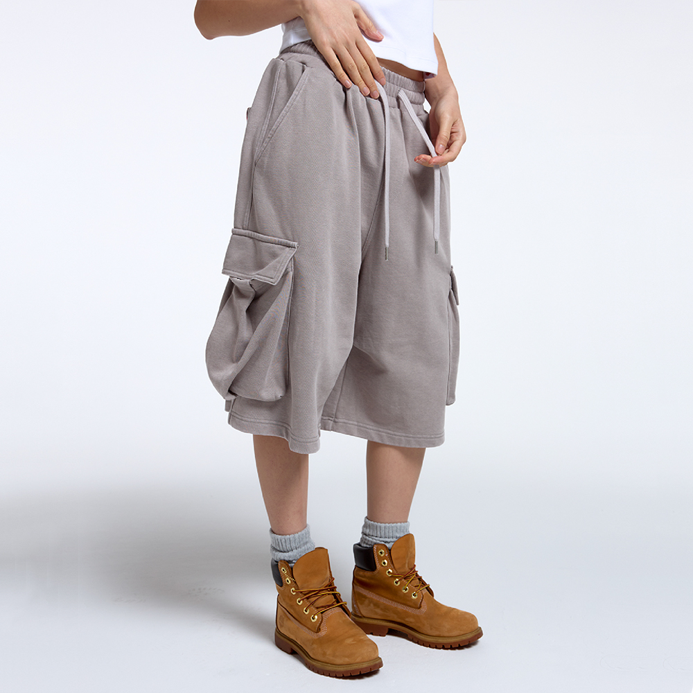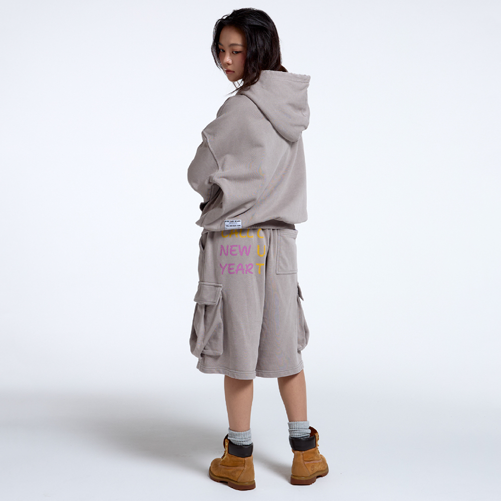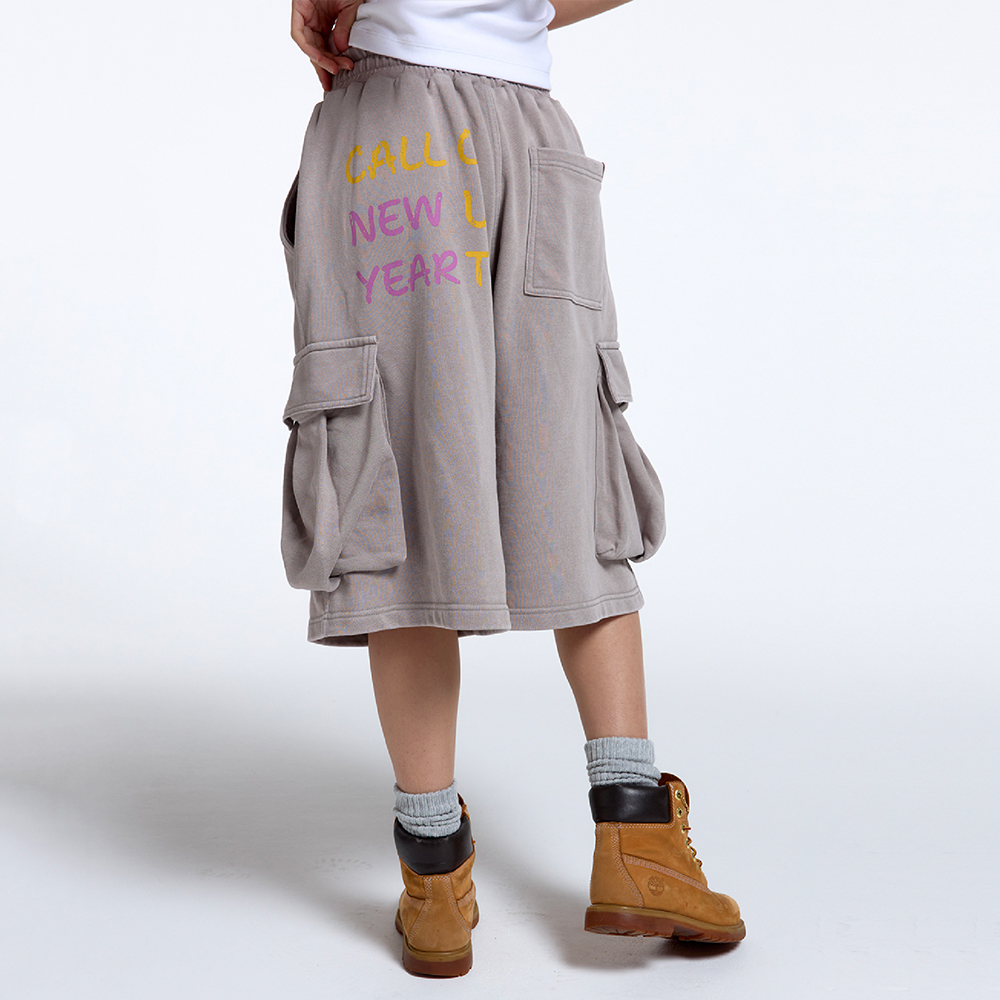 DEAIL -엑시드 워싱 가공 -허리 전체 밴딩 -사이드 입체 카고 포켓 구조 -콜아웃뉴이어 시그니처 라벨 사용 -후면 그래픽 나염