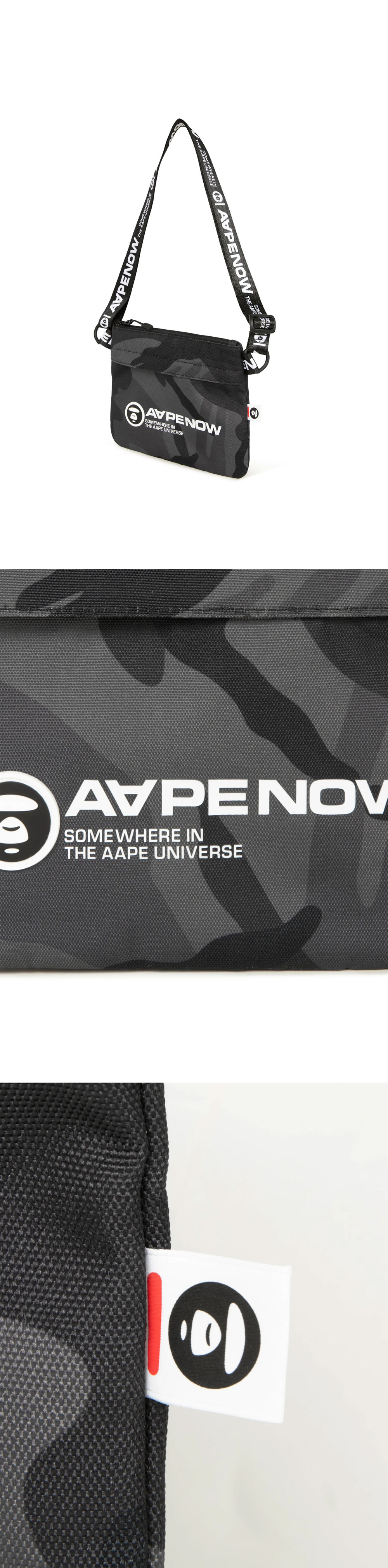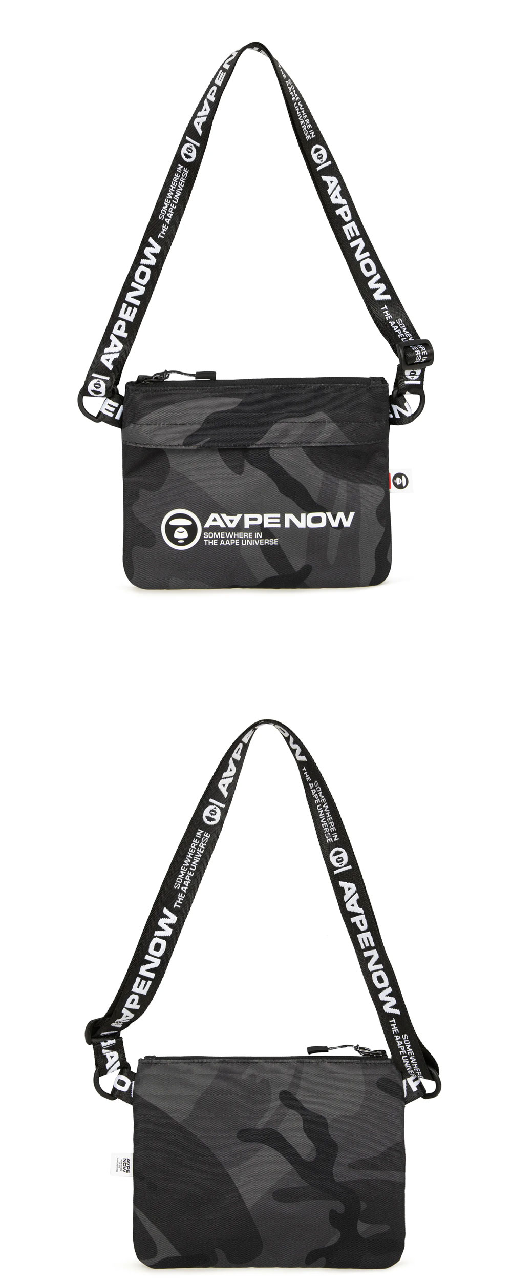 에이프 나우 백 블랙입니다. - 카모 패턴으로 완성하는 스트리트웨어 스타일링 - 지퍼 클로저로 유틸리티 제공 - 체형과 스타일에 맞게 조절 가능한 숄더 스트랩