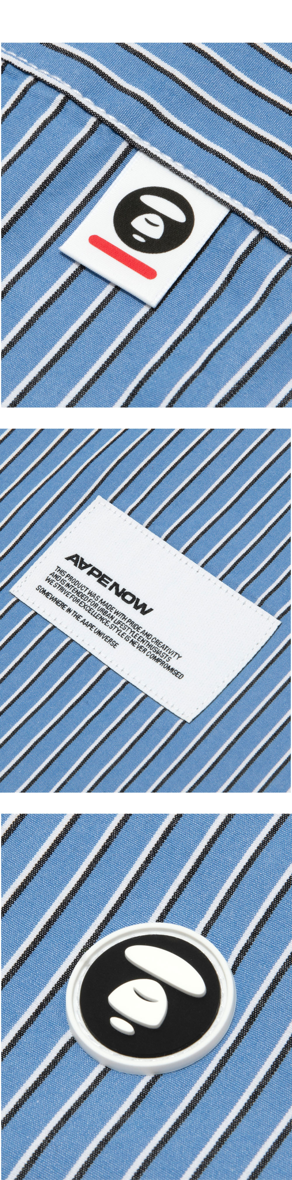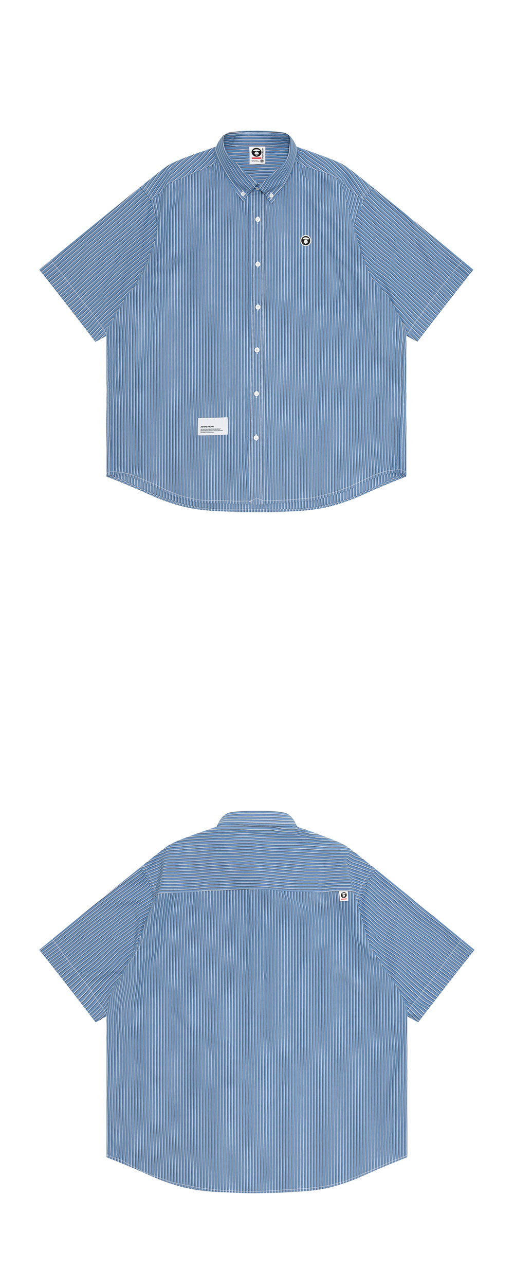 에이프 나우 쇼트 슬리브 셔츠 블루입니다. - 블루 스트라이프 패턴 - 가슴 부분 문페이스 로고 자수 - 전면 하단 AAPE NOW 레터링 라벨 - 클래식한 버튼다운 칼라 디자인