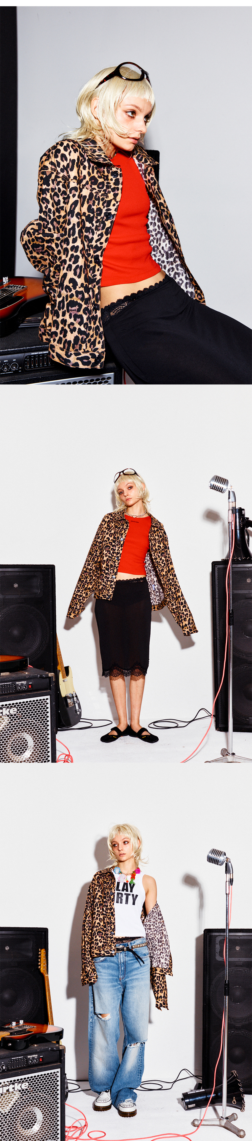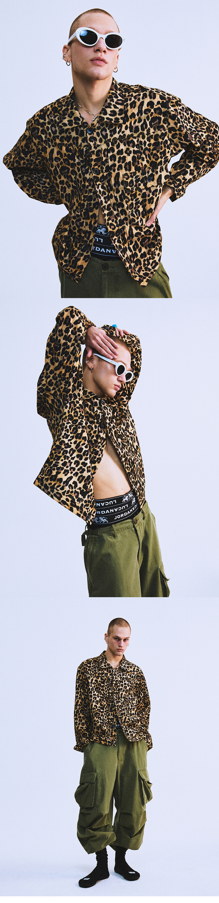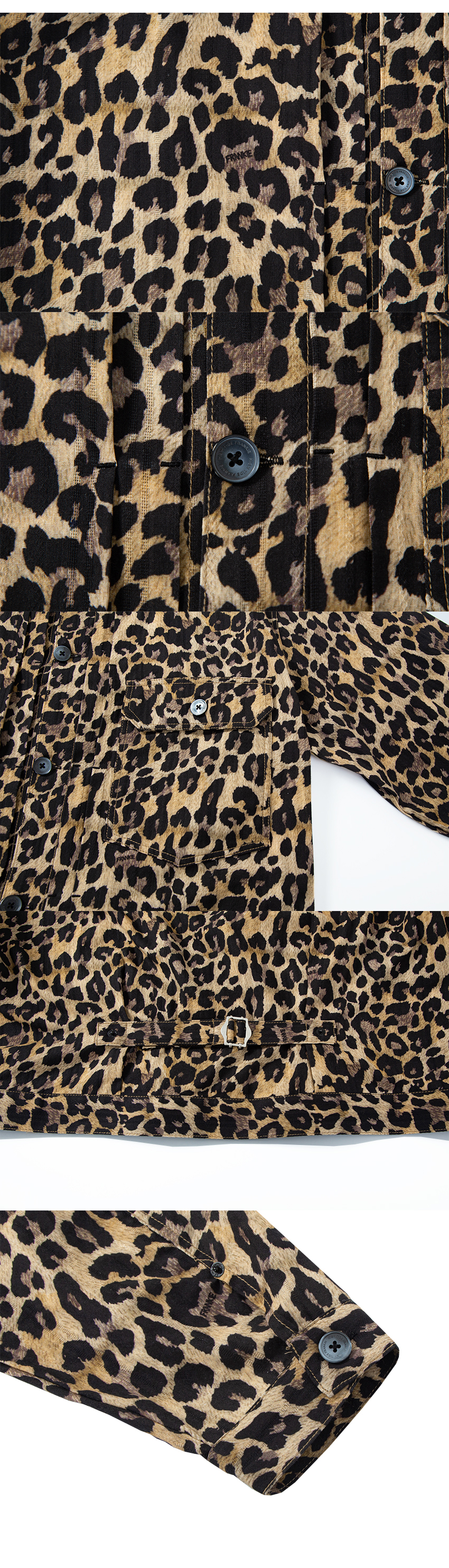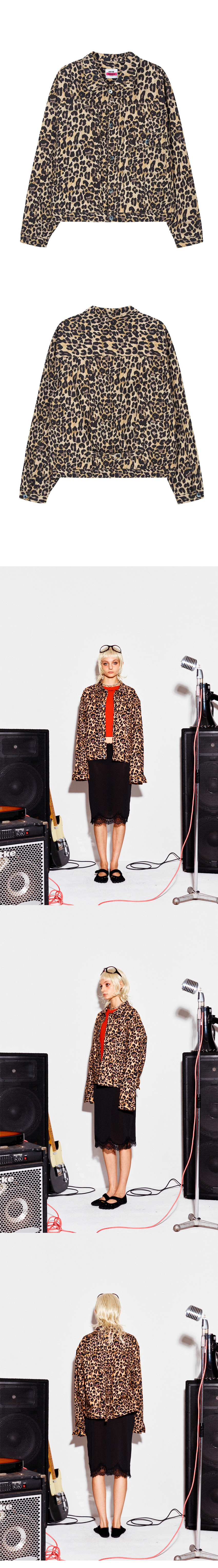 SIZE : S,M,L S 어깨 45.5cm 가슴 54cm 소매 60.5cm 기장 60.5cm M 어깨 48cm 가슴 56cm 소매 63cm 기장 63cm L 어깨 50cm 가슴 59cm 소매 64.5cm 기장 66cm 1~3cm 오차가 발생할수 있음 Model : Maria 171cm / 46kg M 착용 프랭키가 개발한 레오파드 그래픽 패턴을 자가드 면 소재에 디지털 프린트 작업하여 제작한 트러커 자켓 입니다 자가드 면 소재이기에 간절기엔 얇은 자켓처럼 여름철엔 긴팔 셔츠 처럼 활용 할수 있을 정도로 얇고 시원한 제품 입니다 "HIGHTIDE FRANKIE" 음각이 새겨진 단추를 사용 하였으며 전통적인 트러커 자켓의 제작 형식을 충실히 따라 제작 하였습니다 레오파드 패턴 곳곳에 "FRANKIE" 로고를 찾는 재미도 느끼실수 있습니다 물세탁시 줄어드는 현상이 있을수 있습니다 반드시 드라이를 권장 합니다 -혼용률- 면 100% -주의- 드라이 권장 건조기 사용 금지 Made in KOREA