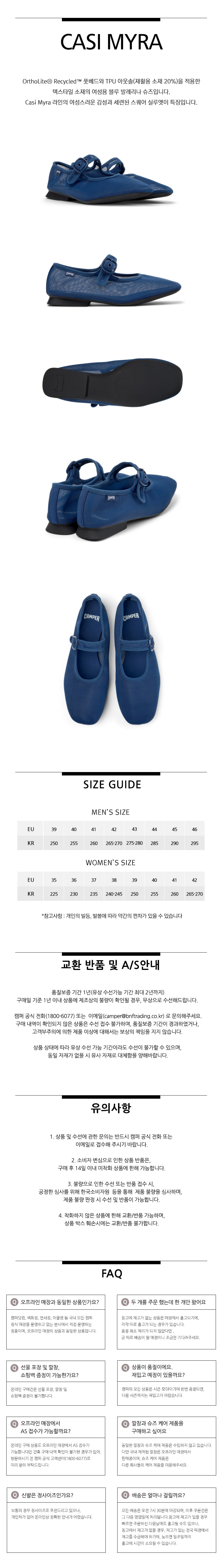 캠퍼 여성 카시미라 플랫슈즈 블루