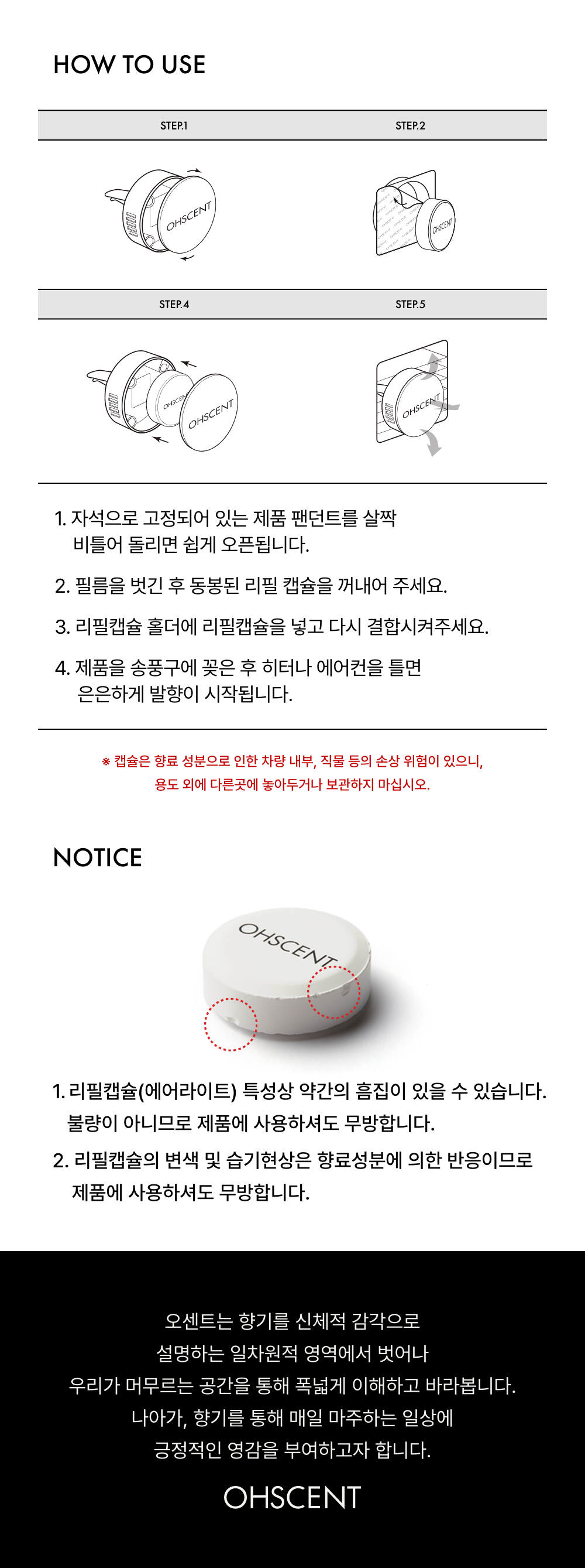 ※ 리필 캡슐 내용물이 가죽이나 의류에 닿을 경우 손상될 수 있으니 주의하세요. 직접 닿는 곳에는 리필 캡슐을 분리한 후 사용해 주세요.