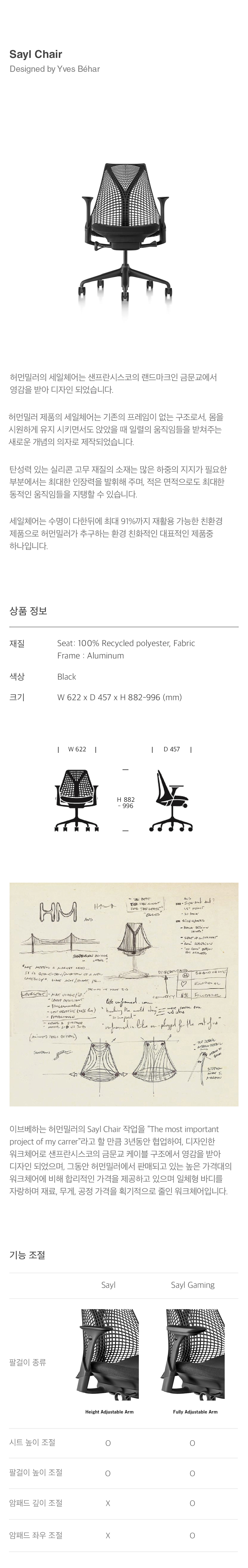 허먼밀러의 세일체어는 샌프란시스코의 랜드마크인 금문교에서 영감을 받아 디자인 되었습니다. 허먼밀러 제품의 세일체어는 기존의 프레임이 없는 구조로서, 몸을 시원하게 유지 시키면서도 앉았을 때 일렬의 움직임들을 받쳐주는 새로운 개념의 의자로 제작되었습니다. 탄성력 있는 실리콘 고무 재질의 소재는 많은 하중의 지지가 필요한 부분에서는 최대한 인장력을 발휘해 주며, 적은 면적으로도 최대한 동적인 움직임들을 지탱할 수 있습니다. 세일체어는 수명이 다한뒤에 최대 91%까지 재활용 가능한 친환경 제품으로 허먼밀러가 추구하는 환경 친화적인 대표적인 제품중 하나입니다.