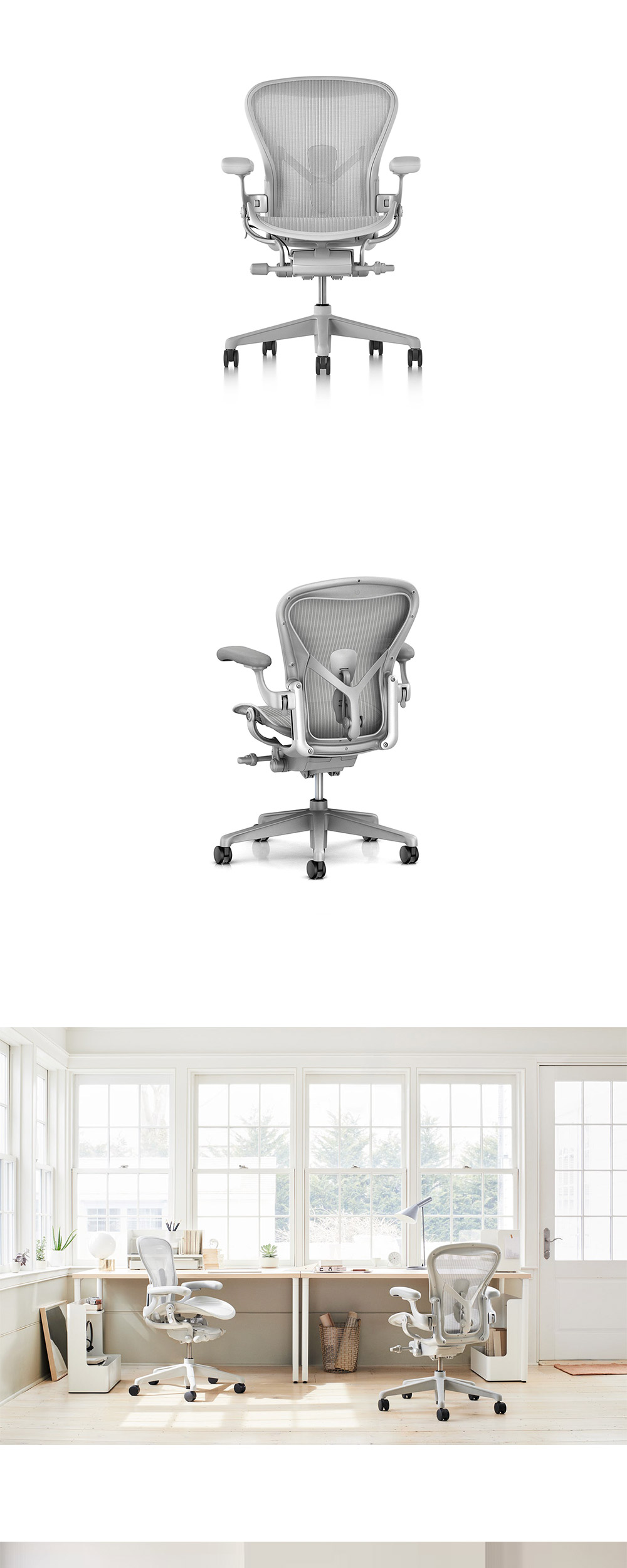 Hermanmiller제품중 세계적으로 가장 유명한 베스트셀러 Aeron chair입니다. 철저한 연구를 통해 제작된 에어론체어는 인체공학적 연구를 가구 디자인에 적용한 대표적인 제품이며, 1994년 출시되어 오늘날까지 전 세계 사무용 의자 시장의 트렌드로 자리 잡았습니다. 인체공학적인 옵션과 세련된 디자인으로 허리와 자세가 편안하도록 해주며, 특수 탄성 소재로 체중 분산은 물론 뛰어난 통기성으로 오랜시간 사용해도 편안함이 지속되는 혁신적인 소재 입니다. 좌석과 등받이에 각각 4개의 다른 탄성으로 구성되어있어 몸에 가장 편안한 착석감을 제공하며, 사용자 중심의 손쉬운 조절이 가능합니다. [Key Features] ㆍ12 year warranty ㆍ통기성이 훌륭한 시트와 등받이 ㆍ8개의 Zone으로 나누어진 정교한 설계로 자세를 바르게 유지 시켜줍니다. ㆍ팔걸이, 등받이, 시트깊이를 자유롭게 조절할 수 있습니다.