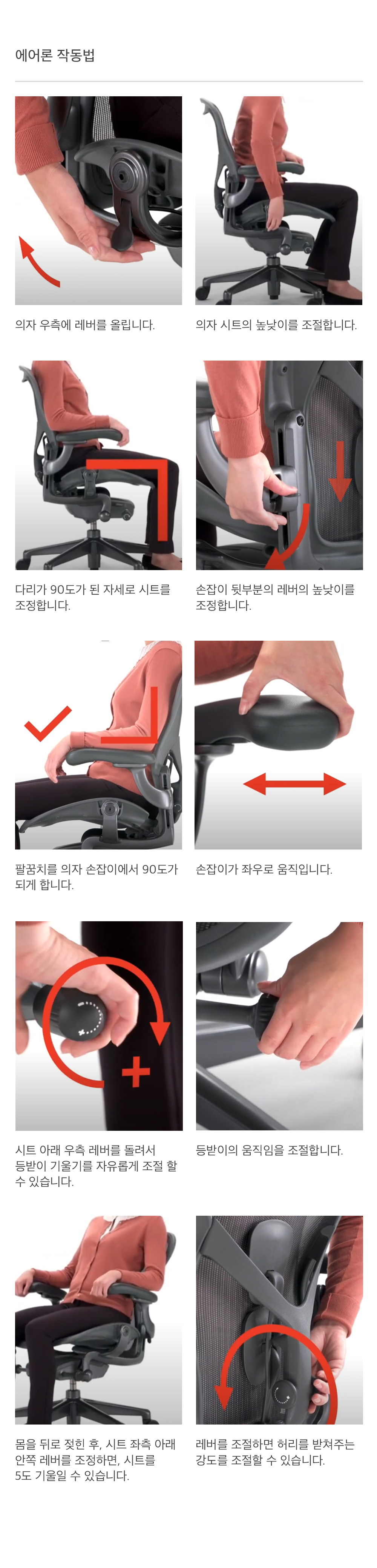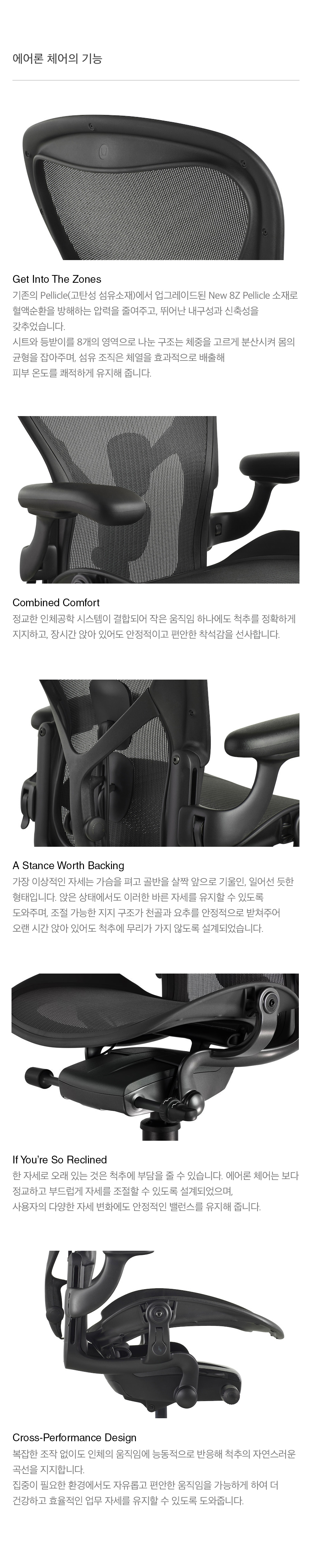 허먼밀러의 베스트셀러인 에어론 체어는 철저한 연구를 통해 제작된 인체공학적 연구를 가구 디자인에 적용한 대표적인 제품이며, 1994년 출시되어 오늘날까지 전 세계 사무용 의자 시장의 트렌드로 자리 잡았습니다. 인체공학적인 옵션과 세련된 디자인으로 허리와 자세가 편안하도록 해주며, 특수 탄성 소재로 체중 분산은 물론 뛰어난 통기성으로 오랜시간 사용해도 편안함이 지속되는 혁신적인 소재 입니다. 좌석과 등받이에 각각 8개의 다른 탄성으로 구성되어있어 몸에 가장 편안한 착석감을 제공하며, 사용자 중심의 손쉬운 조절이 가능합니다.