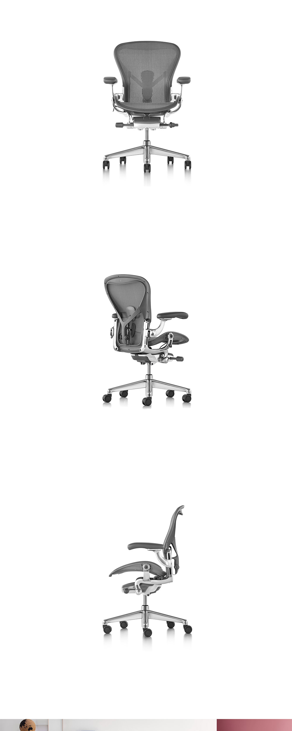 Hermanmiller제품중 세계적으로 가장 유명한 베스트셀러 Aeron chair입니다. 철저한 연구를 통해 제작된 에어론체어는 인체공학적 연구를 가구 디자인에 적용한 대표적인 제품이며, 1994년 출시되어 오늘날까지 전 세계 사무용 의자 시장의 트렌드로 자리 잡았습니다. 인체공학적인 옵션과 세련된 디자인으로 허리와 자세가 편안하도록 해주며, 특수 탄성 소재로 체중 분산은 물론 뛰어난 통기성으로 오랜시간 사용해도 편안함이 지속되는 혁신적인 소재 입니다. 좌석과 등받이에 각각 4개의 다른 탄성으로 구성되어있어 몸에 가장 편안한 착석감을 제공하며, 사용자 중심의 손쉬운 조절이 가능합니다. [Key Features] ㆍ12 year warranty ㆍ통기성이 훌륭한 시트와 등받이 ㆍ8개의 Zone으로 나누어진 정교한 설계로 자세를 바르게 유지 시켜줍니다. ㆍ팔걸이, 등받이, 시트깊이를 자유롭게 조절할 수 있습니다.
