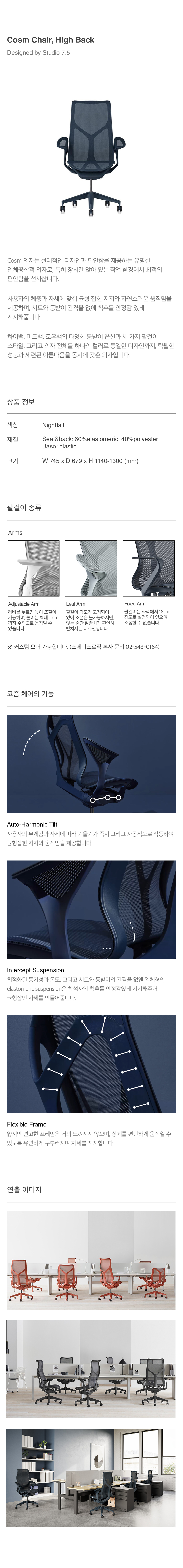 코즘체어는 사용자의 체중과 자세에 따라 균형잡힌 지지와 움직임을 제공합니다. 또한 시트와 등받이의 간격을 없애 척추를 안정감있게 지지해줍니다. [제품 옵션] USA(S) 버전은 ASIA(Y) 버전에 비해 등받이가 더 단단하게 젖혀지며, 틸트 장력이 더 강한 느낌을 제공합니다. 다만, 틸트 강도는 사용자의 체중이나 힘에 따라 다르게 느껴질 수 있습니다. - USA(S) 버전 틸트 권장 체중: 55~136kg - ASIA(Y) 버전 틸트 권장 체중: 45~96kg 현재 스페이스로직에서는 ASIA(Y) 버전을 기본으로 판매하고 있으며, USA(S) 버전을 원하실 경우 별도 문의를 통해 주문 진행이 가능합니다.