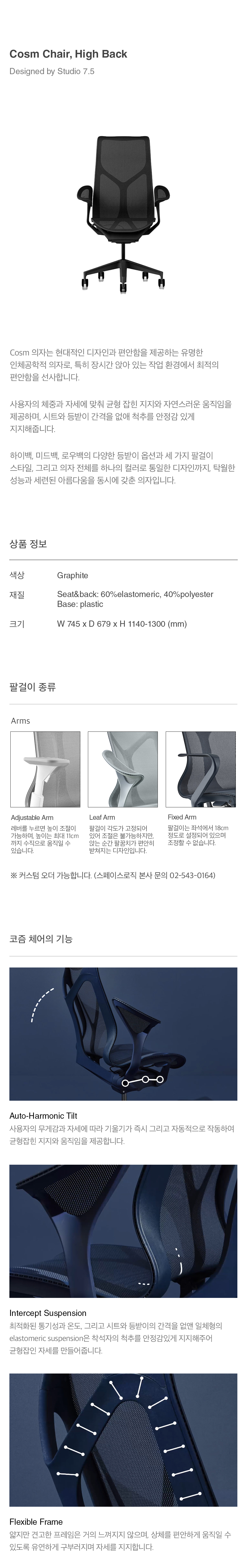 코즘체어는 사용자의 체중과 자세에 따라 균형잡힌 지지와 움직임을 제공합니다. 또한 시트와 등받이의 간격을 없애 척추를 안정감있게 지지해줍니다. [제품 옵션] USA(S) 버전은 ASIA(Y) 버전에 비해 등받이가 더 단단하게 젖혀지며, 틸트 장력이 더 강한 느낌을 제공합니다. 다만, 틸트 강도는 사용자의 체중이나 힘에 따라 다르게 느껴질 수 있습니다. - USA(S) 버전 틸트 권장 체중: 55~136kg - ASIA(Y) 버전 틸트 권장 체중: 45~96kg 현재 스페이스로직에서는 ASIA(Y) 버전을 기본으로 판매하고 있으며, USA(S) 버전을 원하실 경우 별도 문의를 통해 주문 진행이 가능합니다.