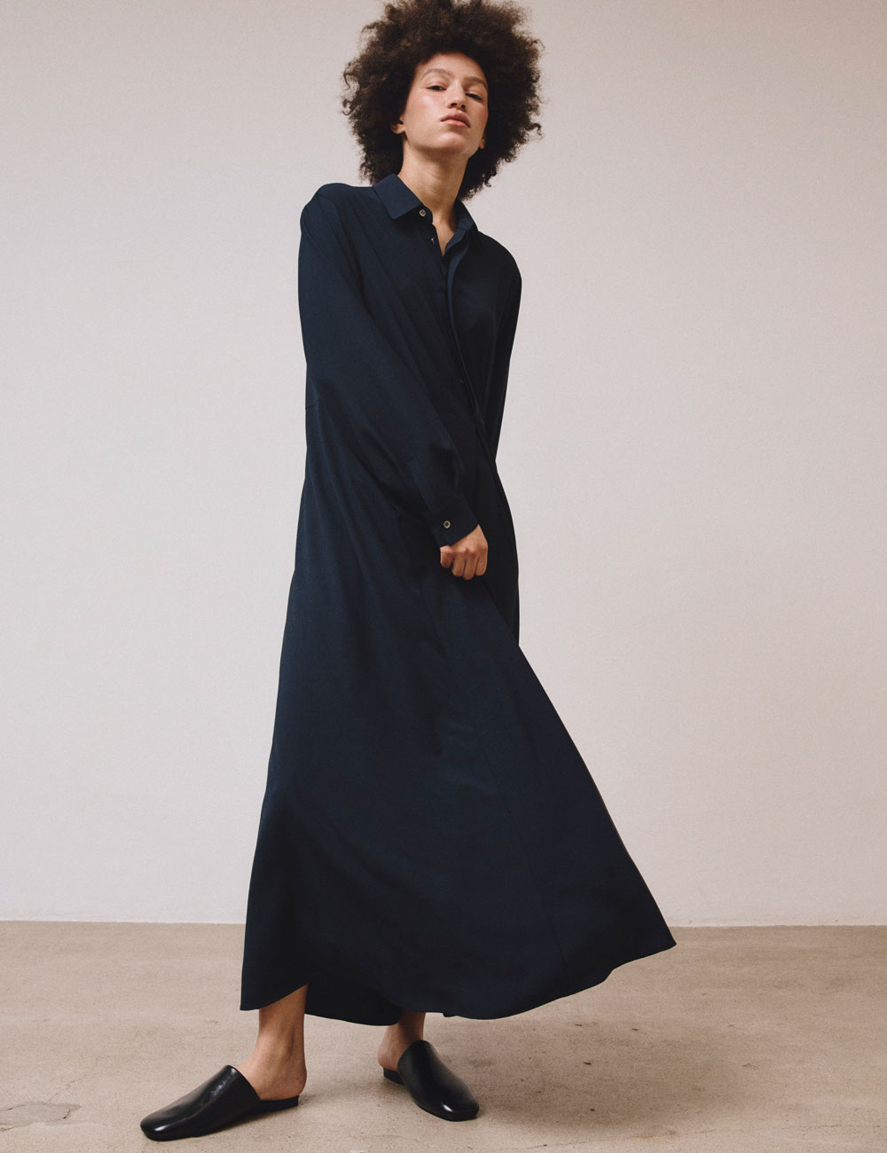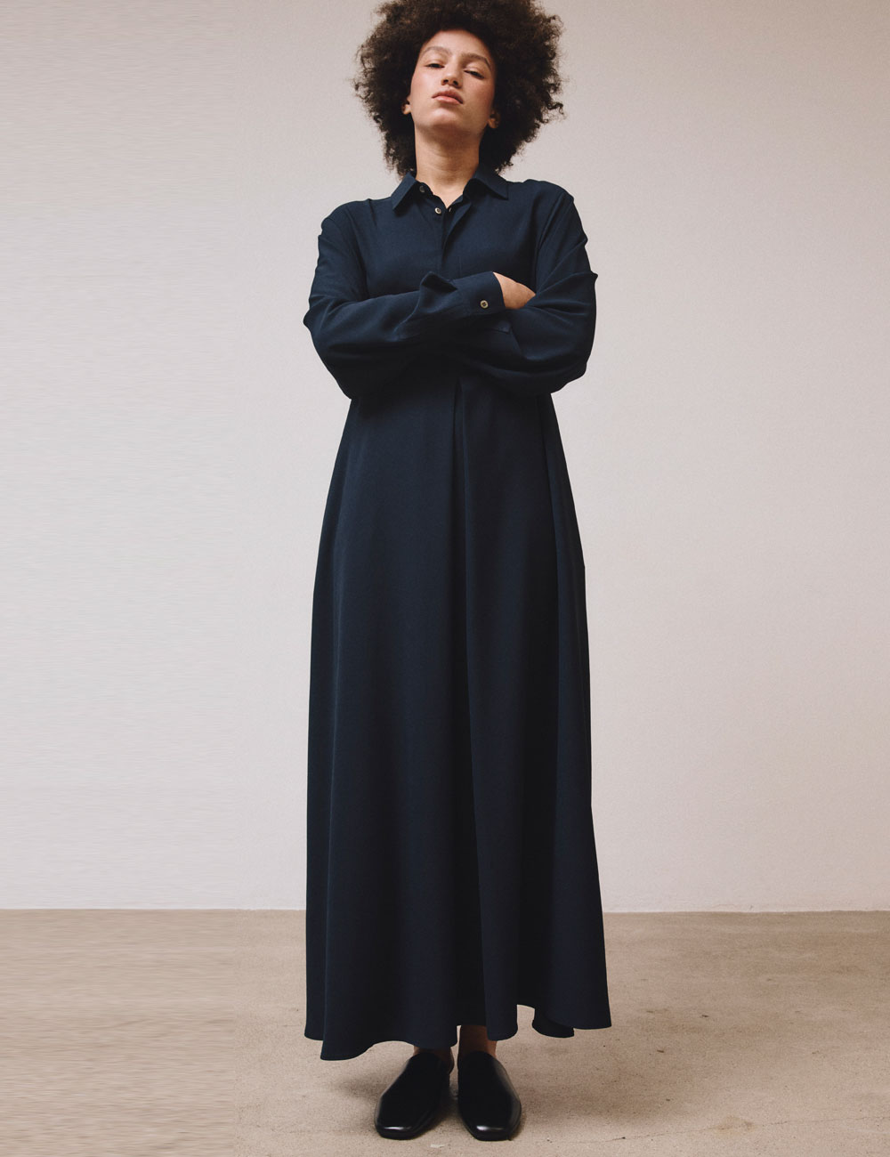 - 세미 오버핏의 셔츠 드레스 - 구김이 가지 않는 유연한 소재로 부드럽고 매끈한 착용감 - 히든 버튼 여밈과 사이드 포켓 - 스커트 전면 맞주름과 사이드 벨트고리 디테일