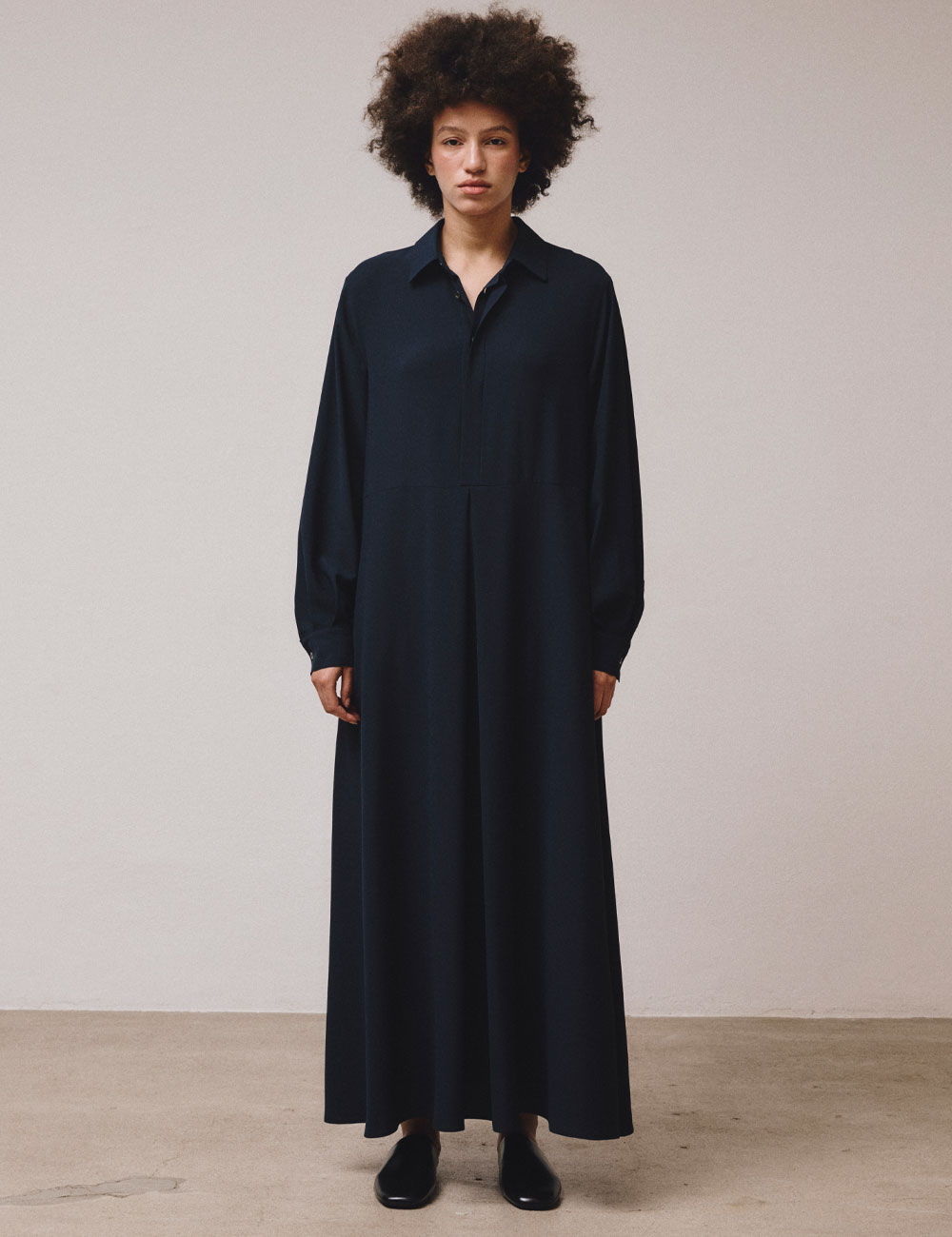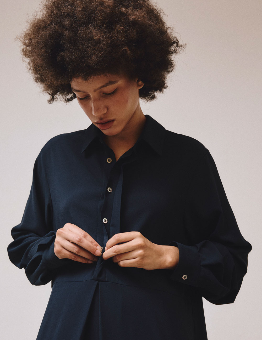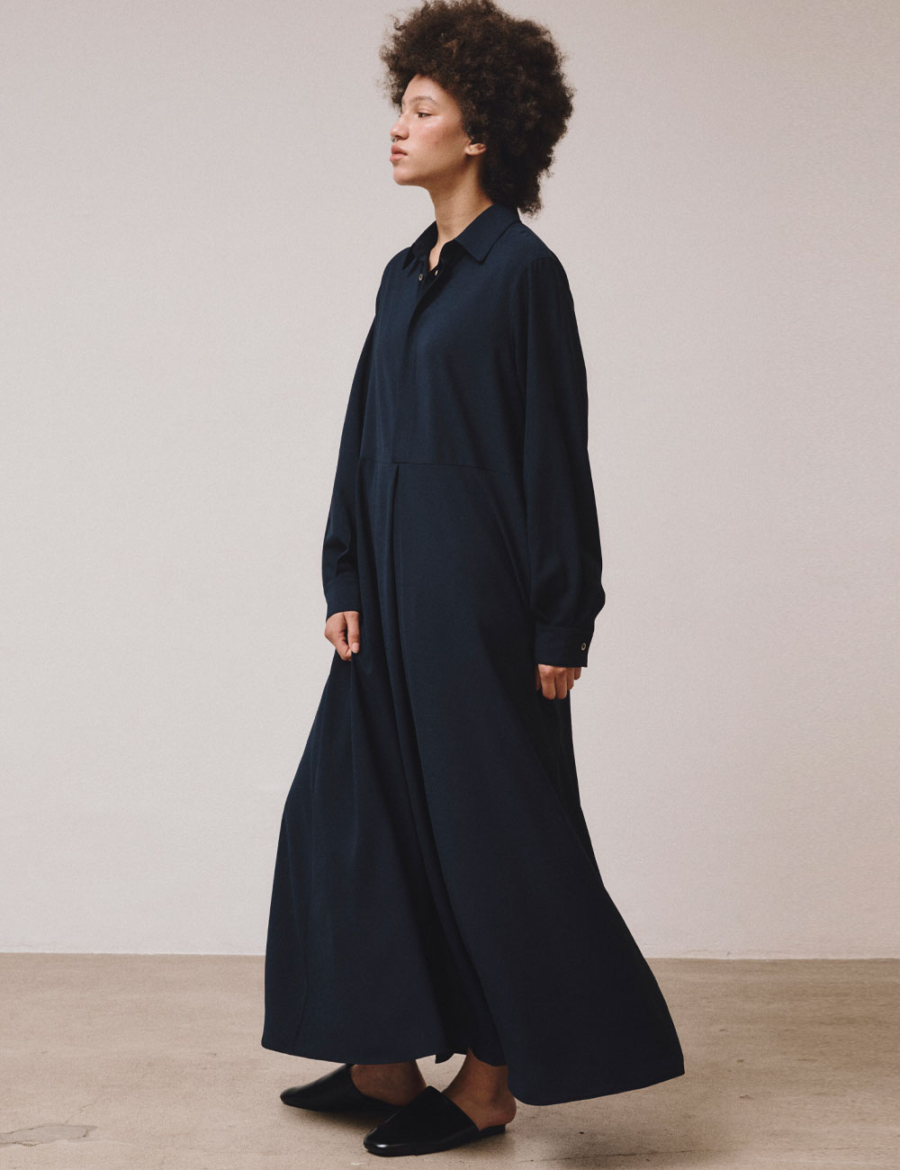 - 세미 오버핏의 셔츠 드레스 - 구김이 가지 않는 유연한 소재로 부드럽고 매끈한 착용감 - 히든 버튼 여밈과 사이드 포켓 - 스커트 전면 맞주름과 사이드 벨트고리 디테일