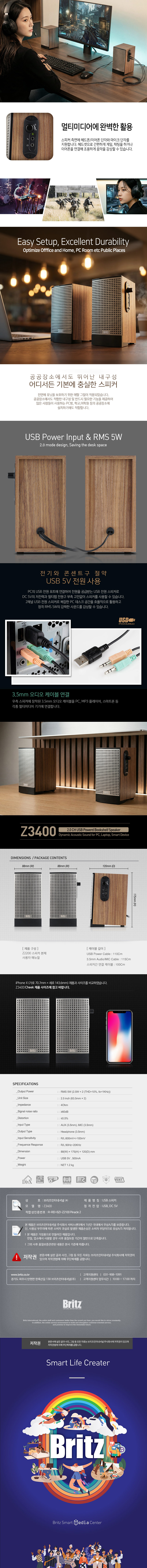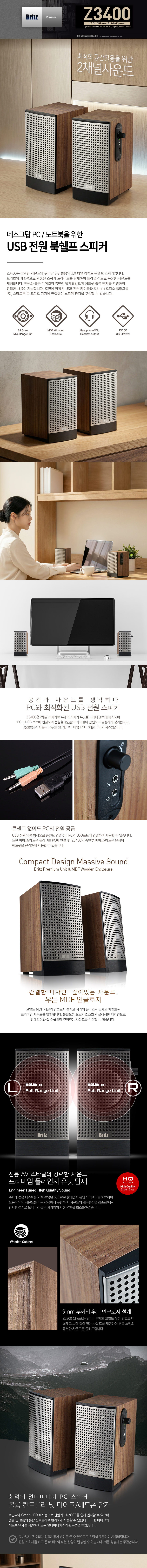 브리츠(Britz) Z3400은 데스크톱 환경에 최적화된 **'우든(Wood) 2채널 USB PC 스피커입니다 -우든(MDF) 인클로저로 풍부한 음색 -편리한 USB 전원 방식 - 공간 활용도가 높은 2채널 디자인 - 클래식하고 고급스러운 데스크테리어 효과