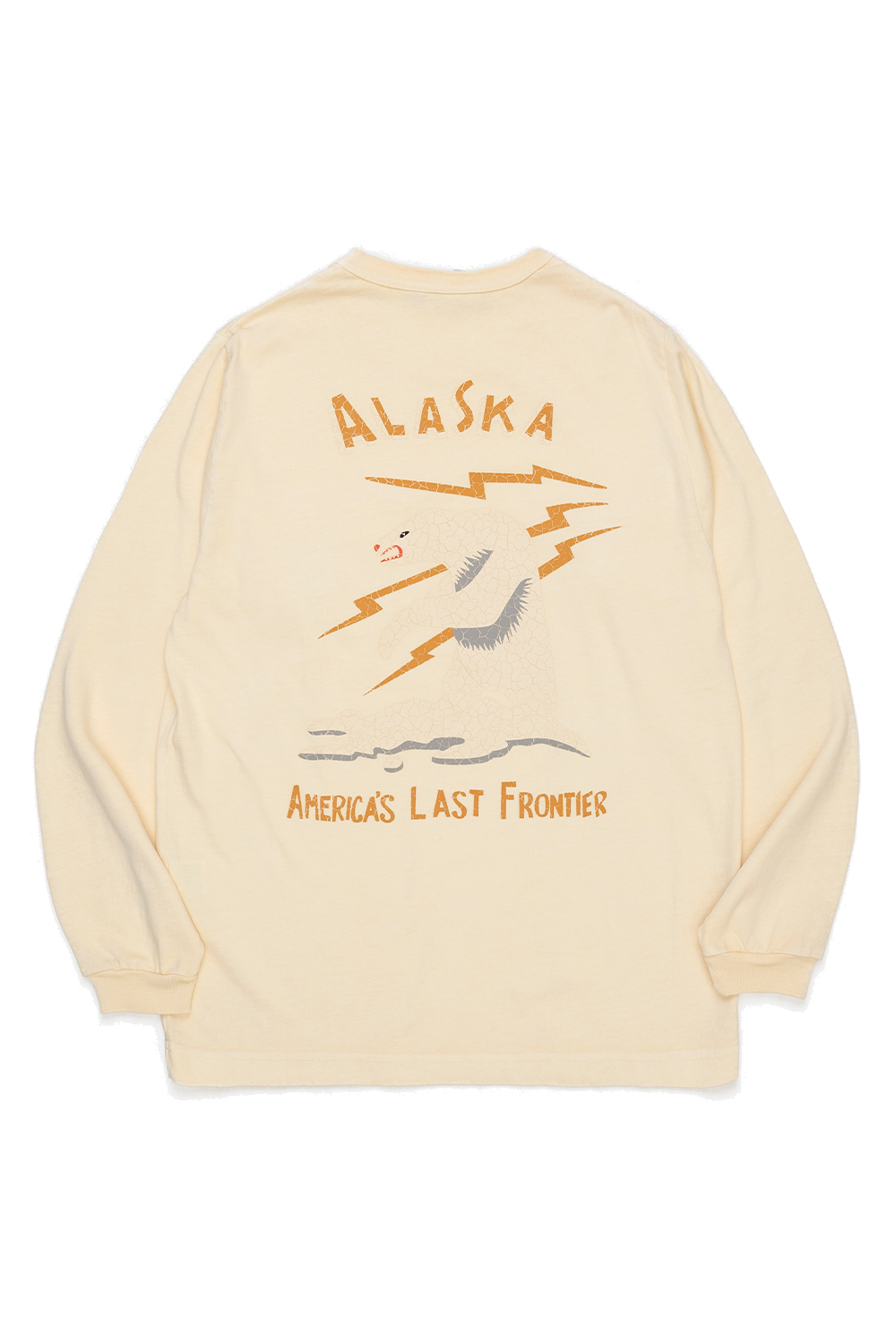Houston Japan 22385 Pigment U.S. Cotton Print Tee (Alaska) - Natural 7.6온스의 미국산 코튼 원단을 사용한 긴팔티셔츠로, 피그먼트 가공을 더해 자연스러운 색감과 빈티지한 분위기를 내는 제품입니다. 오픈엔드 실을 사용해 원사 사이에 공기감이 살아 있으며, 드라이하면서도 거친 터치감이 특징입니다. 전면에는 크랙 기법으로 표현한 알래스카 그래픽을 적용했으며, 프린트 이후 한번 더 피그먼트 가공을 거쳐 깊이 있는 에이징 무드를 더했습니다. *Cotton 100% * 빛에 의한 제품의 색감 차이가 존재 할 수 있습니다. * Made in China