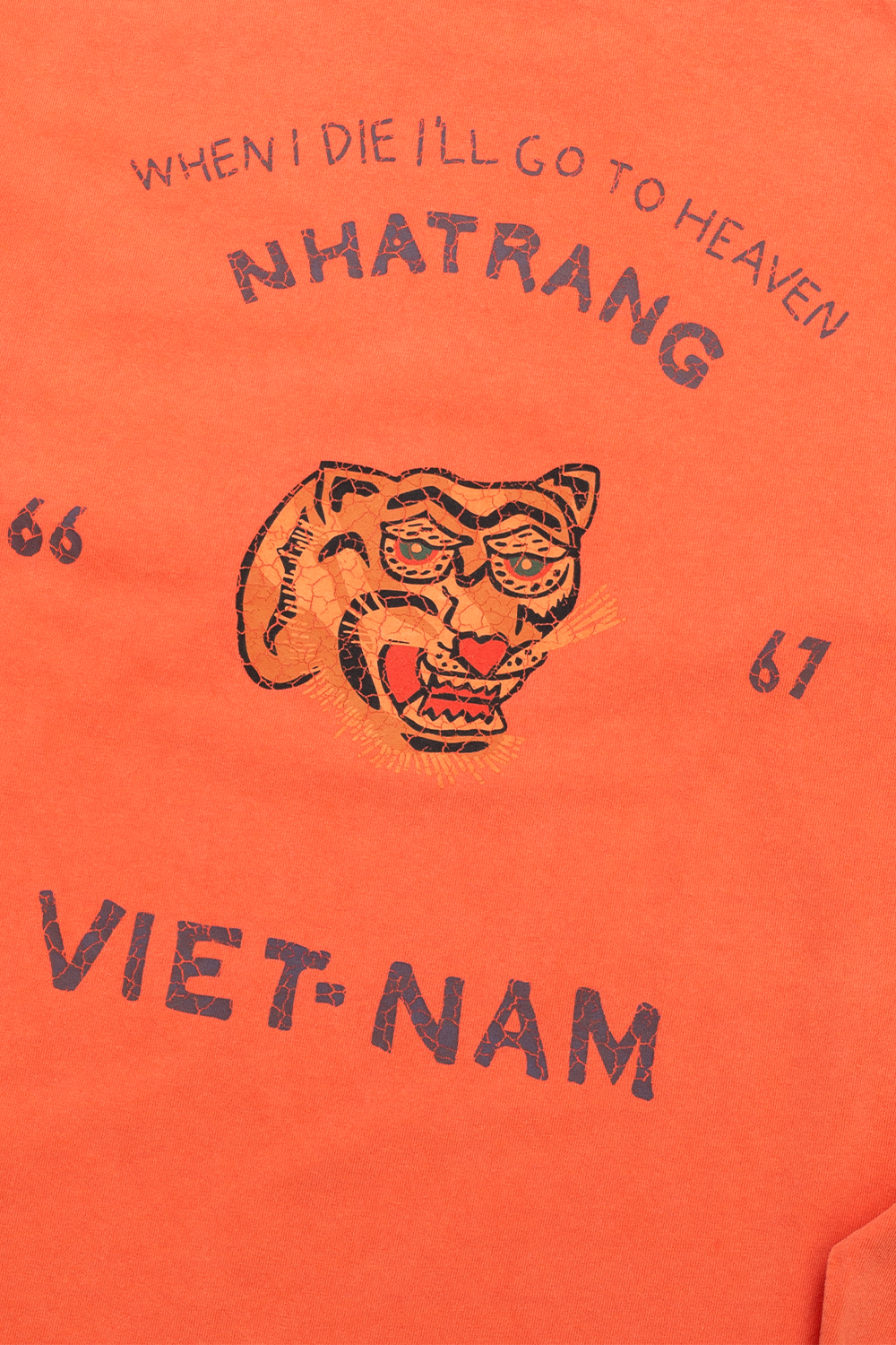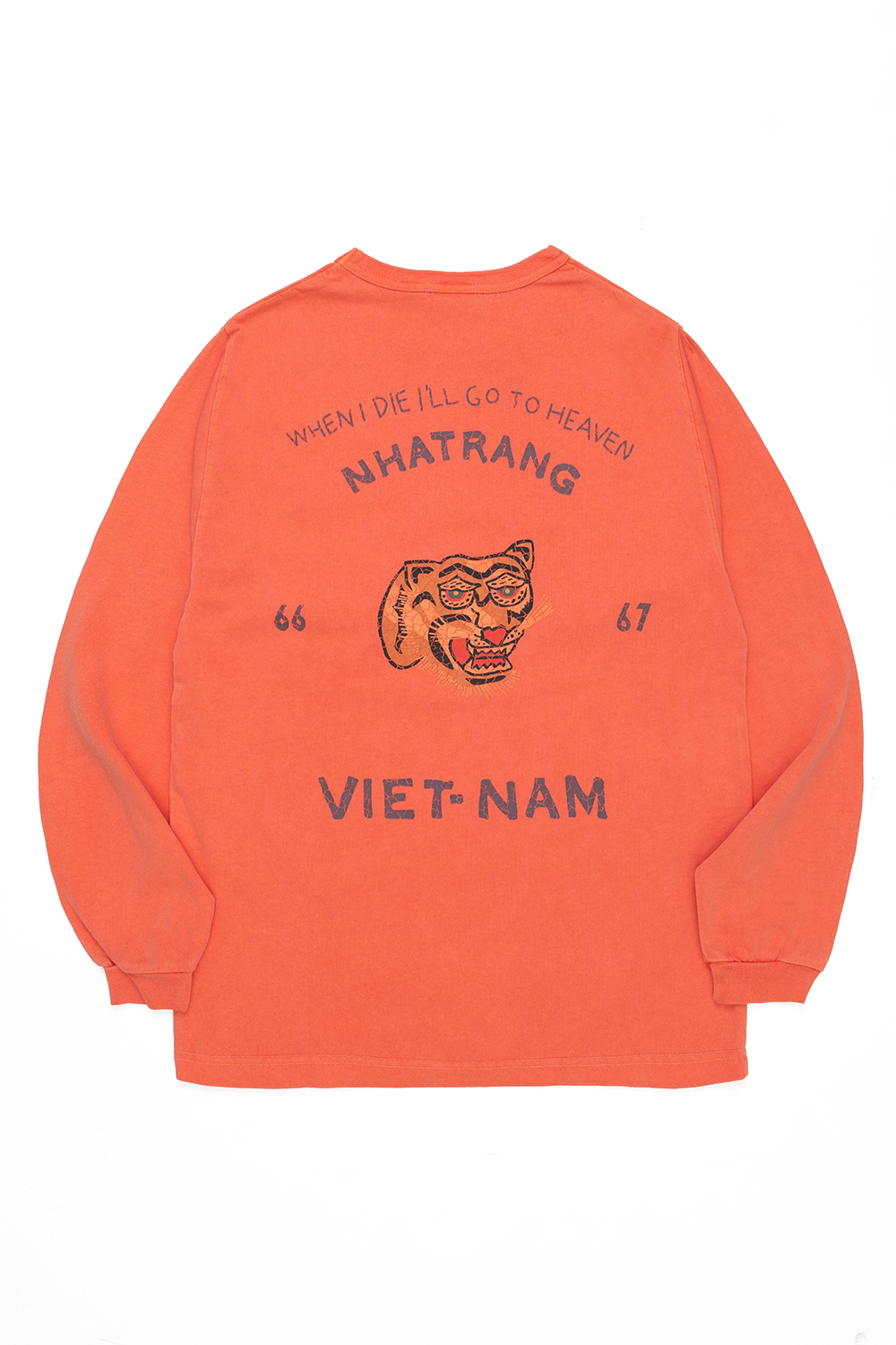 Houston Japan 22384 Pigment U.S. Cotton Print Tee (Vietnam) - Salmon Pink 7.6온스의 미국산 코튼 원단을 사용한 긴팔티셔츠로, 피그먼트 가공을 더해 자연스러운 색감과 빈티지한 분위기를 내는 제품입니다. 오픈엔드 실을 사용해 원사 사이에 공기감이 살아 있으며, 드라이하면서도 거친 터치감이 특징입니다. 전면에는 크랙 기법으로 표현한 베트남 자켓 그래픽을 적용했으며, 프린트 이후 한번 더 피그먼트 가공을 거쳐 깊이 있는 에이징 무드를 더했습니다. *Cotton 100% * 빛에 의한 제품의 색감 차이가 존재 할 수 있습니다. * Made in China