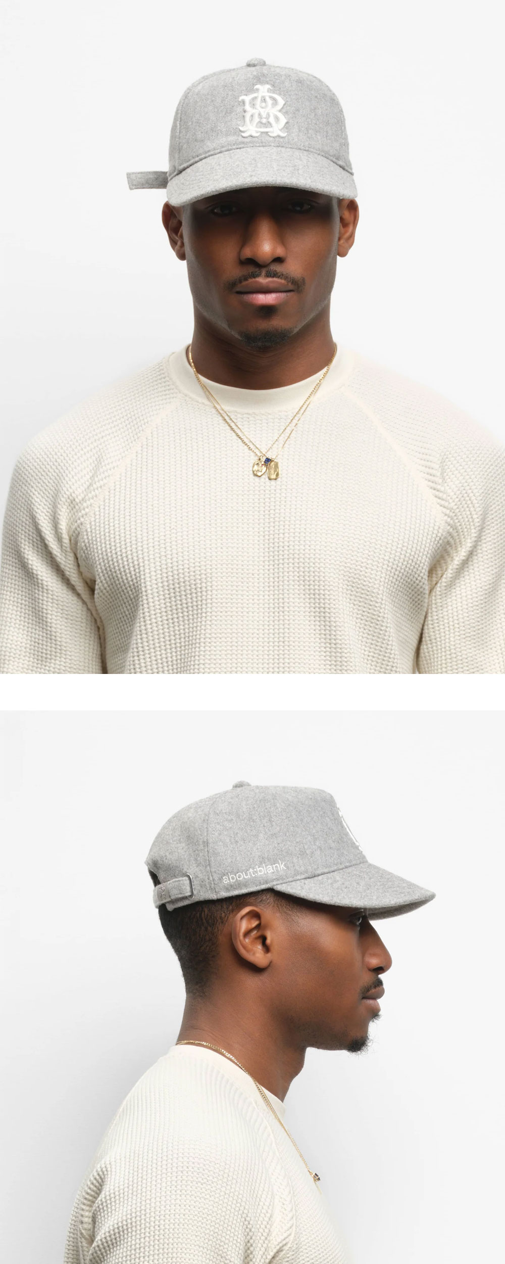 어바웃 블랭크 모노그램 캡 그레이 에크루입니다. - 넓은 챙과 뾰족한 모자 형태 - 간편한 사이즈 조절을 위한 금속 잠금 장치 - 울 혼방 소재 - 3D 모노그램 자수